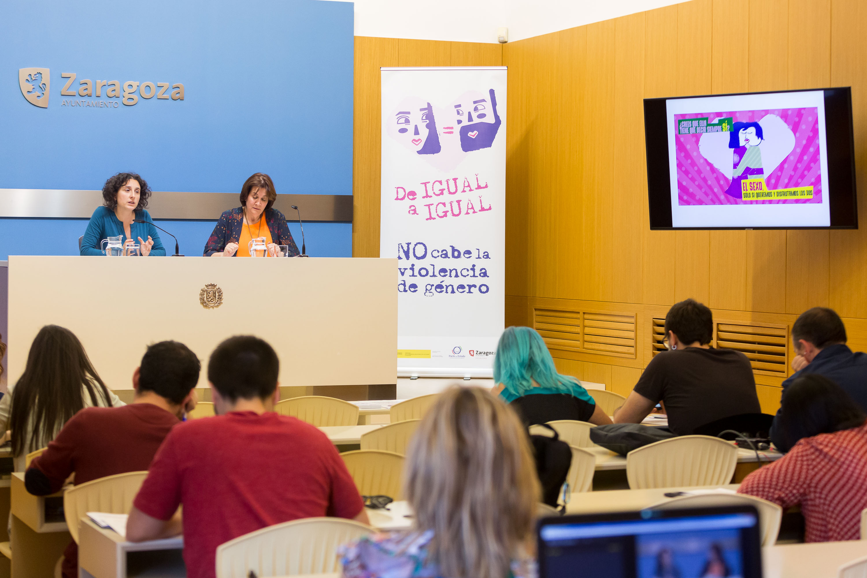 `De igual a igual no cabe la violencia de género'. Es es el lema principal de la campaña de sensibilización que hoy ha presentado el Ayuntamiento de Zaragoza, especialmente dirigida a la población joven. El Servicio municipal de Igualdad ha desarrollado esta iniciativa con cargo al presupuesto procedente del Pacto de Estado en materia de violencia de género y de acuerdo a las directrices del II Plan de Igualdad de Zaragoza 2018-2021.