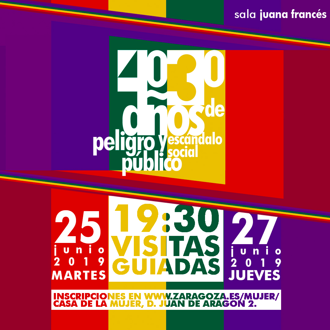 El Servicio municipal de Igualdad ha organizado dos sesiones de visitas guiadas a la exposición `40/30 años de peligro público y escándalo social', ubicada en la sala Juana Francés de la Casa de la Mujer. Serán el martes 25 y el jueves 27 de junio, ambas de 19,30 a 20,30 horas y previa inscripción en la web municipal http://www.zaragoza.es/sede/servicio/formulario/442/