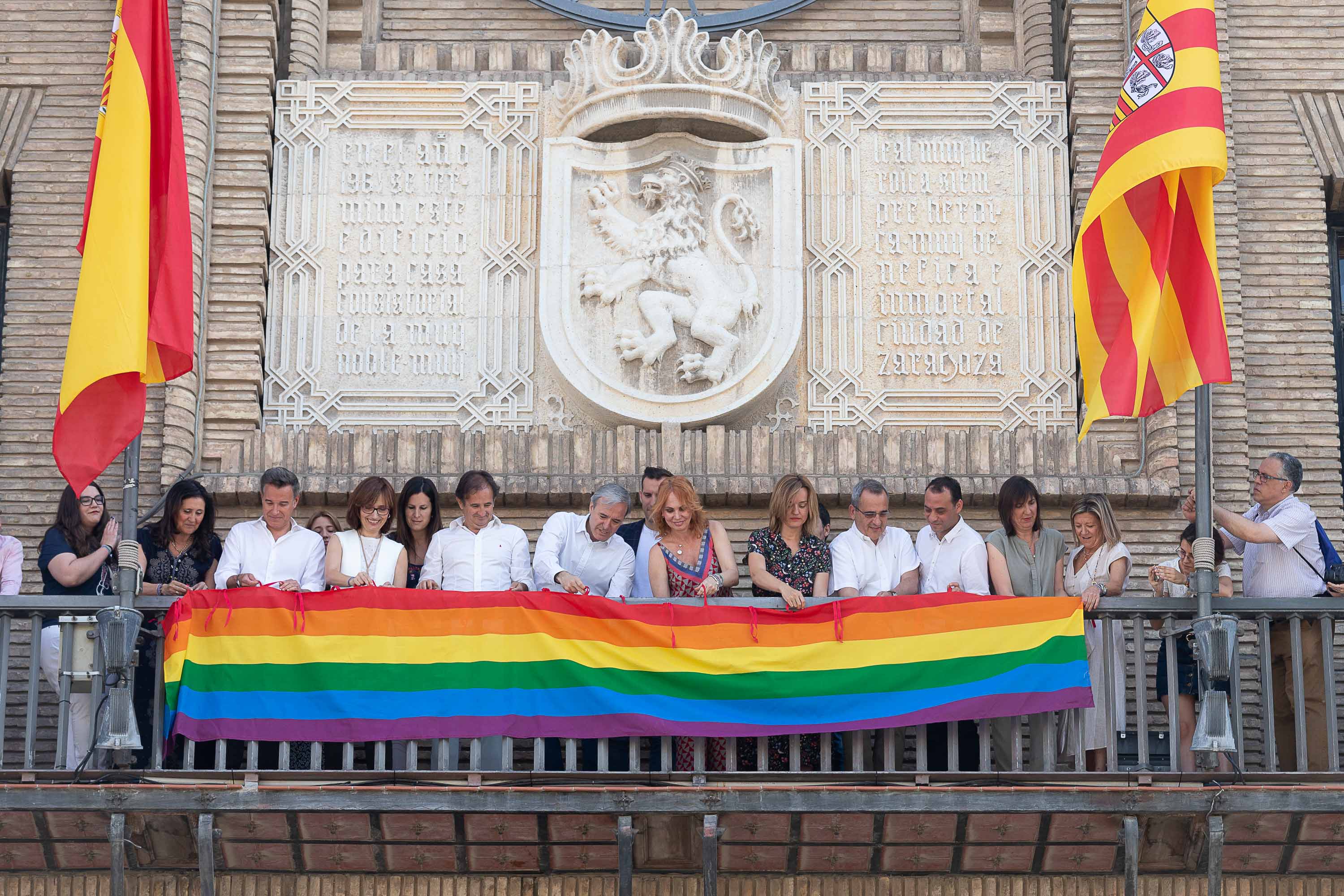 El Ayuntamiento de Zaragoza se suma, un año más, al reconocimiento social de las personas LGTBIQ en el Día del Orgullo. El alcalde Jorge Azcón, el consejero de Acción Social y Familia, Ángel Lorén, y la concejala delegada de Mujer, Igualdad y Juventud, M.ª Fe Antoñanzas, han izado en el balcón del Consistorio las banderas arcoíris y trans para visibilizar el apoyo de la ciudad a la diversidad y el rechazo a toda discriminación. Además, el Ayuntamiento de Zaragoza iluminará hoy la fuente de La Hispanidad, en la plaza del Pilar, y la del Parque Grande, con los colores de la bandera arcoíris.