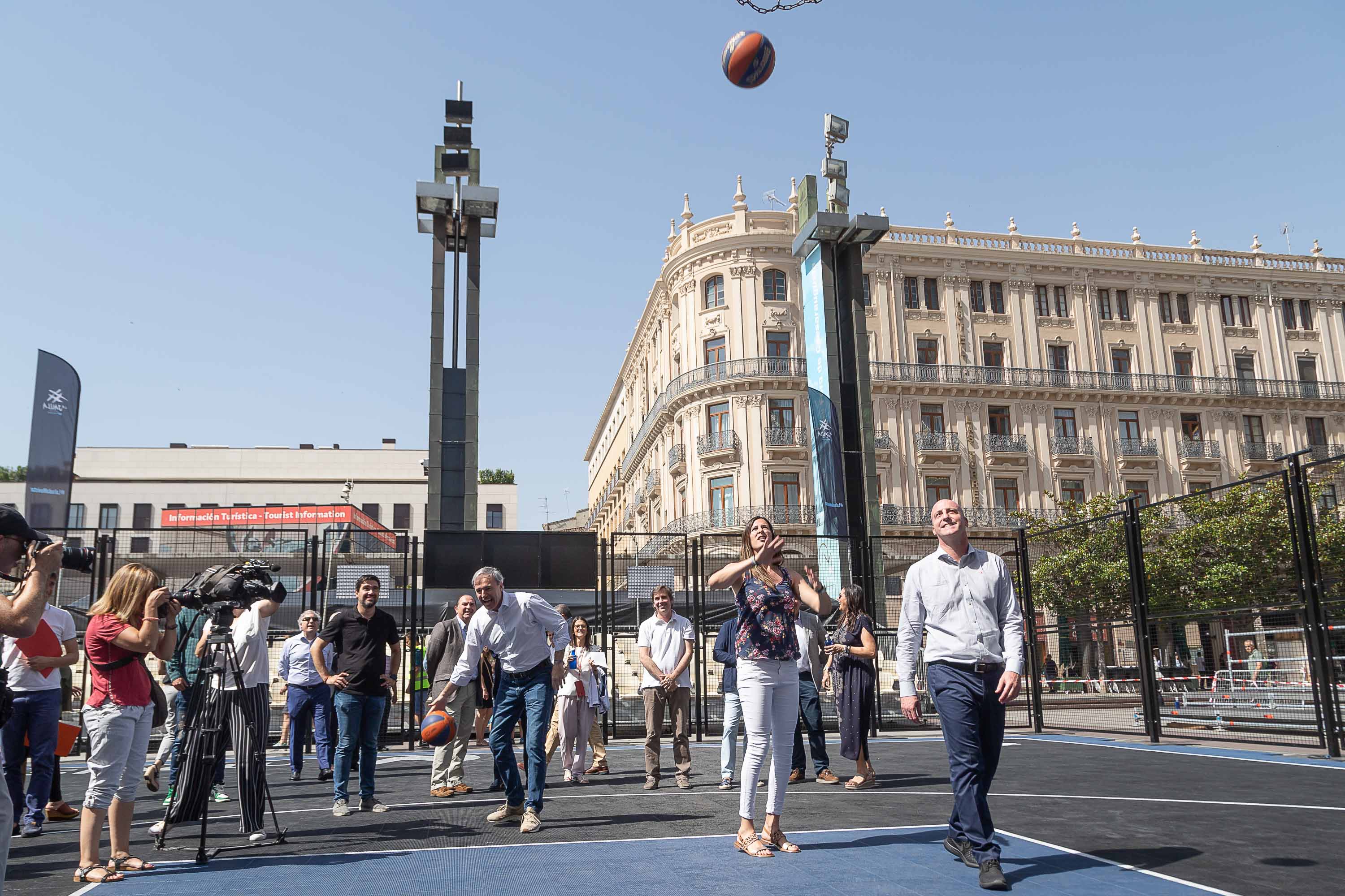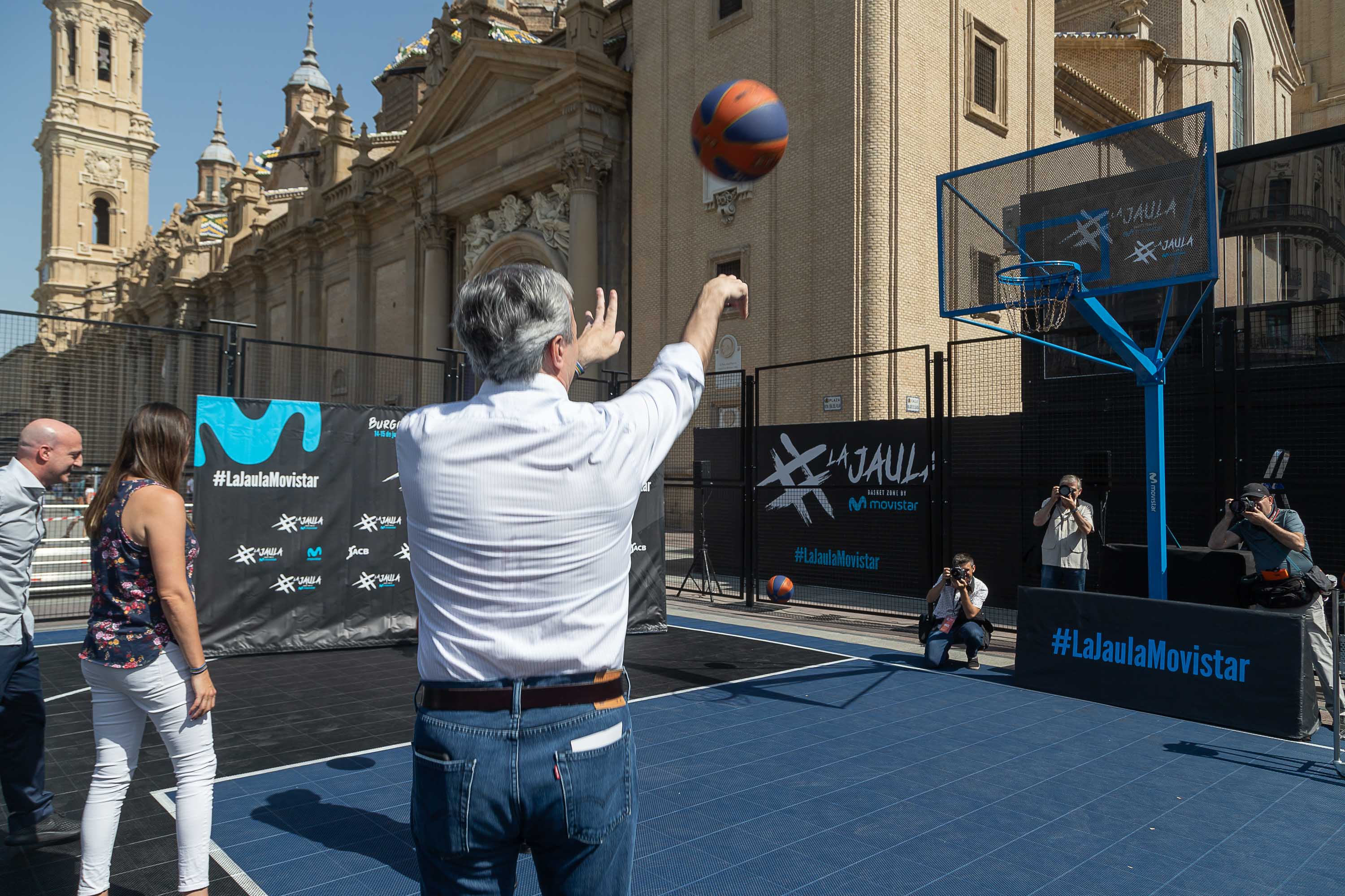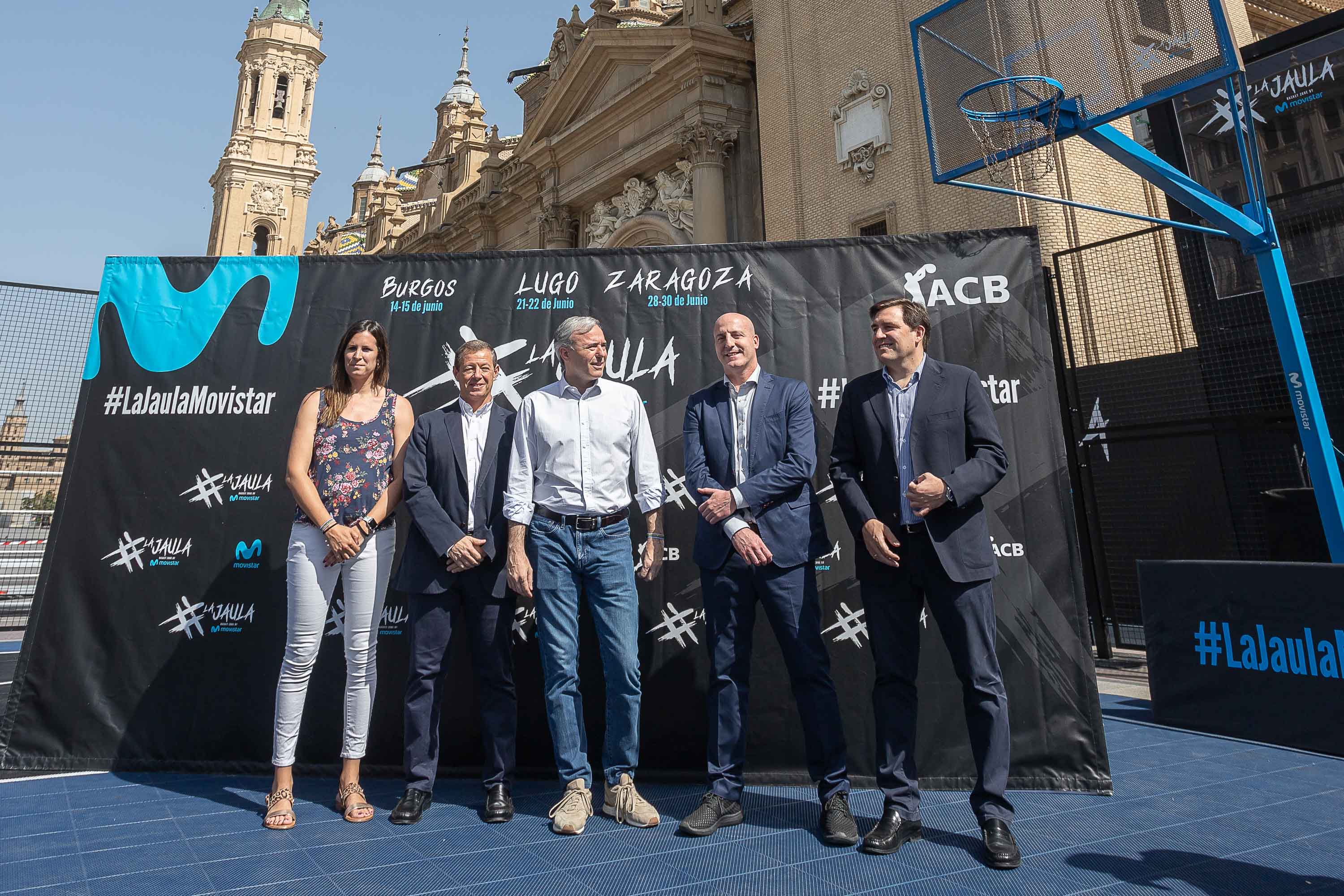 Este fin de semana la plaza del Pilar los amantes del baloncesto tienen una cita en la plaza del Pilar con La Jaula ACB Movistar, una competición 3x3 de ámbito nacional que llega a Zaragoza para celebrar su fase final, tras las previas de Lugo y Burgos. El evento, que cuenta con la colaboración de la sociedad municipal Zaragoza Deporte, ha sido presentado hoy por el alcalde Jorge Azcón, la concejala de Deporte, Cristina García, el director de marca de la ACB, Ricardo de Diego, el director de Telefónica en Aragón, Federico Tartón, y el presidente del Basket Zaragoza, Reynaldo Benito, junto a otros representantes del club como Predrag Savovic y Pep Cargol.