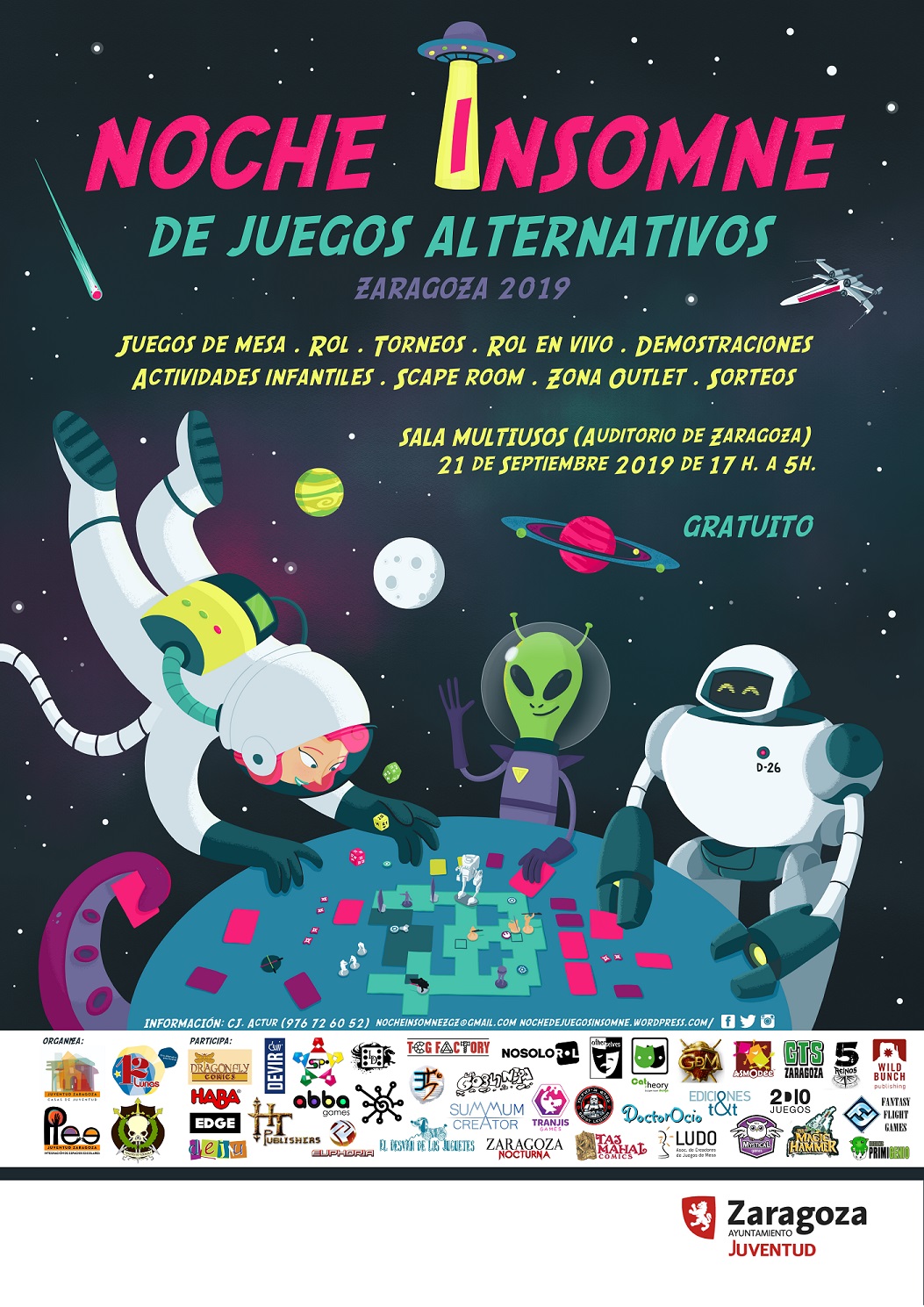 El Servicio de Juventud del Ayuntamiento de Zaragoza se vuelca en esta iniciativa con la implicación de las Casas de Juventud y PIEES de Actur, Rabal, Casablanca, Juslibol, La Jota, Miralbueno, San Gregorio, San José y Santa Isabel, y del programa 12 Lunas. Más de 40 empresas, editoriales y asociaciones del sector colaboran ofreciendo actividades lúdicas a las personas asistentes. Este año la ambientación temática es 'Ciencia Ficción espacial', un guiño al 50 aniversario de la llegada del hombre a la luna.