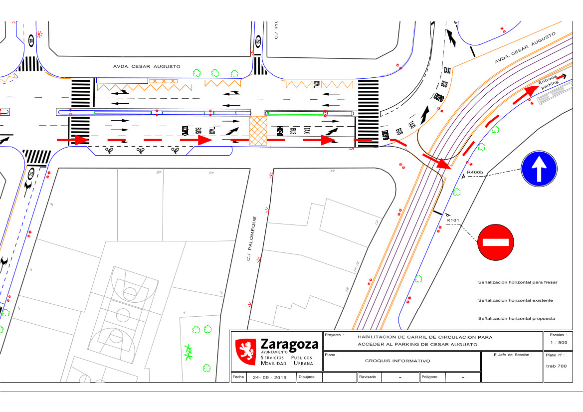 Este miércoles, a lo largo de la mañana, se abrirá el nuevo acceso para vehículos al parking de Cesar Agusto desde la avenida del mismo nombre en su cruce con el Coso. Para ello, quedará habilitado un tercer carril, a la derecha, que permitirá el giro, tal y como puede apreciarse en el siguiente plano.