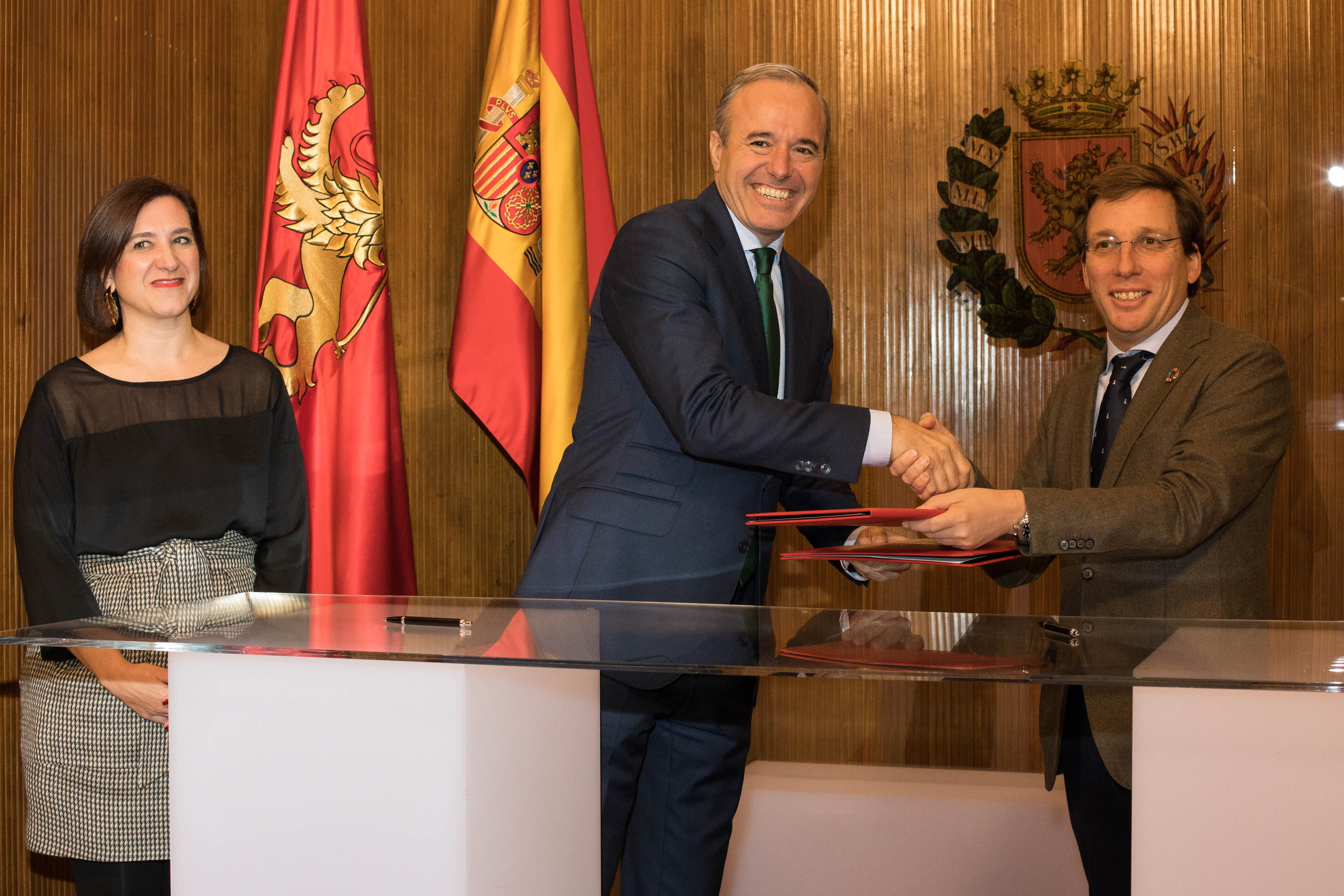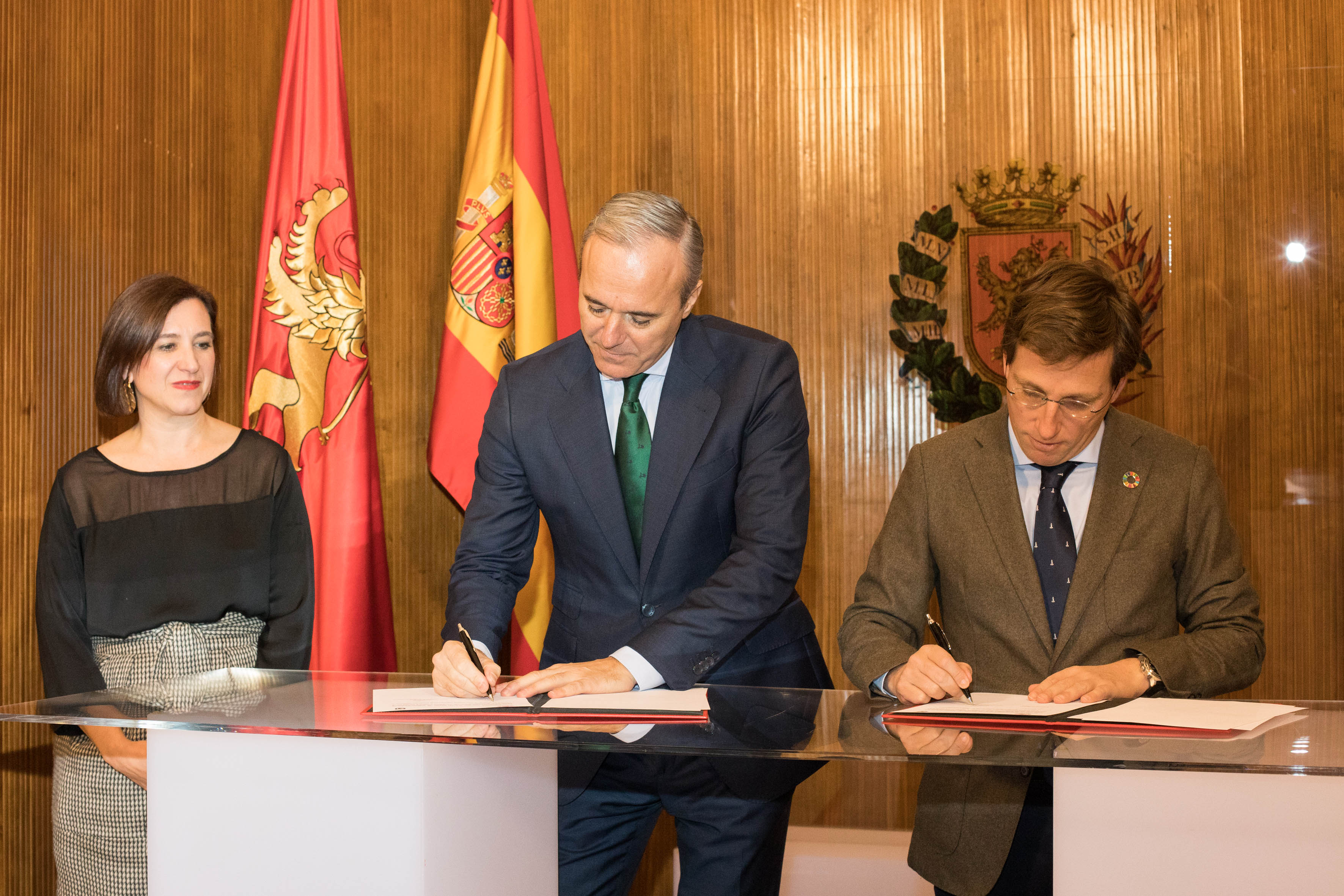 El alcalde Jorge Azcón, acompañado por la vicealcaldesa Sara Fernández, ha firmado en el Ayuntamiento con el alcalde de Madrid, José Luis Martínez Almeida, un protocolo general de intenciones para colaborar en el fomento de proyectos, actuaciones e iniciativas que promocionen y potencien la oferta turística de ambas ciudades.