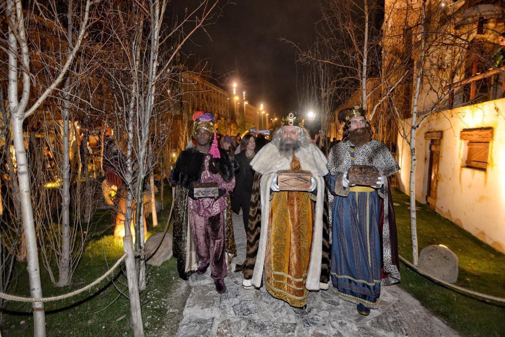 Los Reyes Magos han sido recibidos por la alcaldesa accidental, Sara Fernández, y distintos concejales de la Corporación Municipal en la Plaza del Pilar, con una traca de fuegos artificiales dándoles la bienvenida. Seguidamente, han recorrido el Belén, y a su paso por el puente se ha encendido la estrella que los ha dirigido al portal para realizar la adoración al Niño Jesús. Al término de la misma, la comitiva se ha dirigido al escenario instalado en la misma plaza, donde SS Majestades han saludado y han dirigido unas palabras a todos los niños y niñas que se encontraban esperándoles.