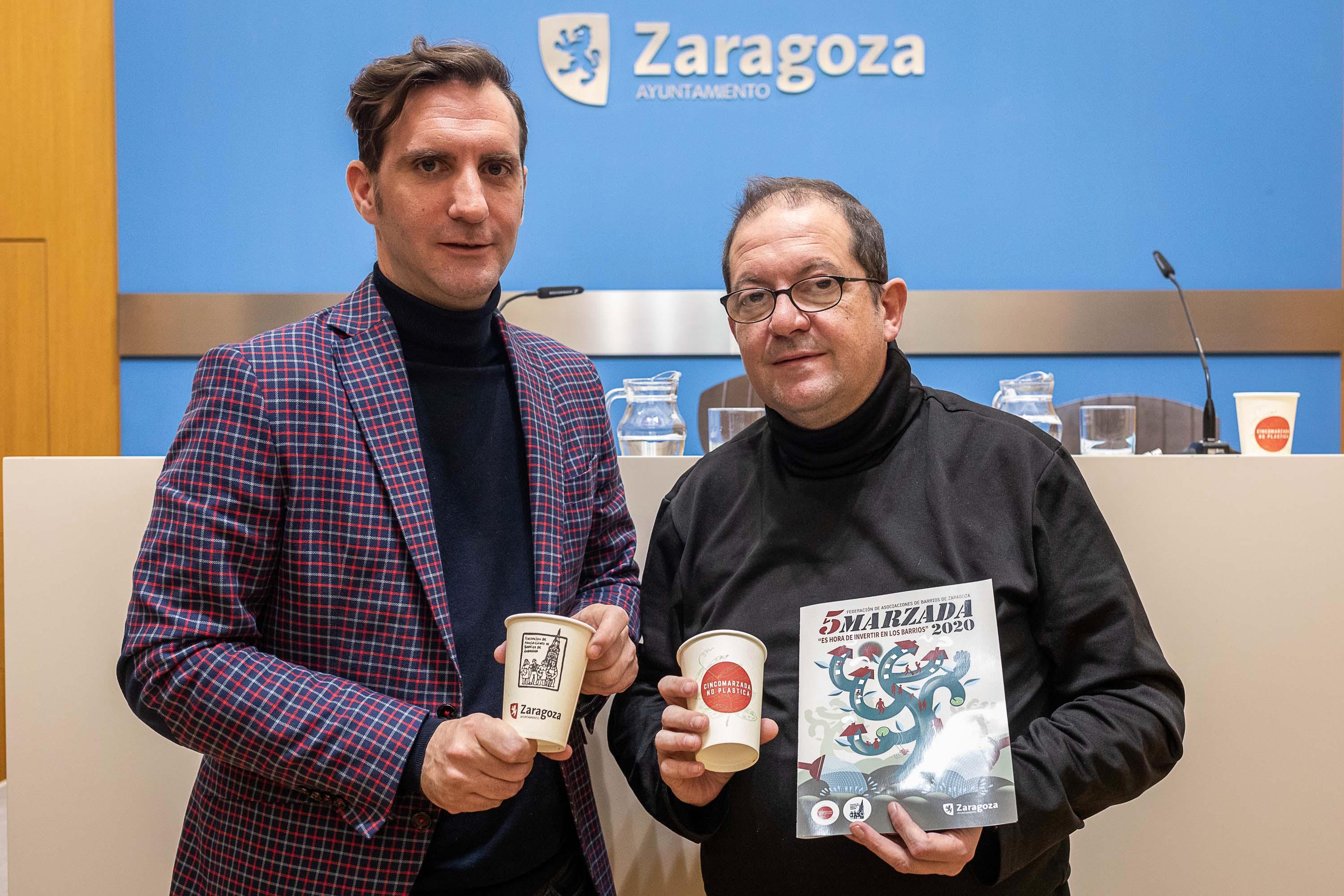El consejero de Participación y Relación con los Ciudadanos, Javier Rodrigo, acompañado del vicepresidente de la Federación de Asociaciones de Barrios de Zaragoza (FABZ), Rafael Tejedor, ha presentado la programación y el operativo previsto para esta fiesta en la que el año anterior participaron cerca de 130.000 personas. El Ayuntamiento de Zaragoza destina 21.000 euros a la programación cultural y organización de la Cincomarzada mediante el contrato firmado entre Zaragoza Cultural y la FABZ.