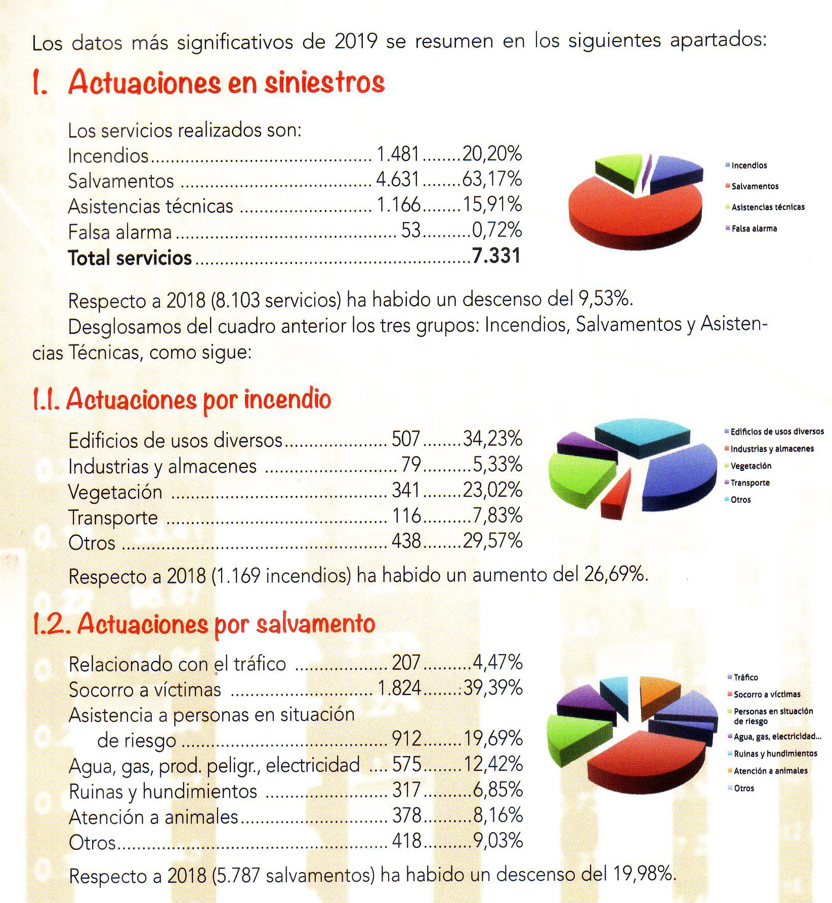 A lo largo de 2019 se llevaron a cabo 7.331 servicios, de los cuales la gran mayoría (63,17%) fueron salvamentos de distinto tipo. La cifra global es menor que la del año anterior (8.103 servicios) aunque, sin embargo, ha aumentado notablemente el número de incendios: de 1.169 fuegos ocurridos en 2018 se ha pasado a 1.481 en 2019, un 26,69% más.