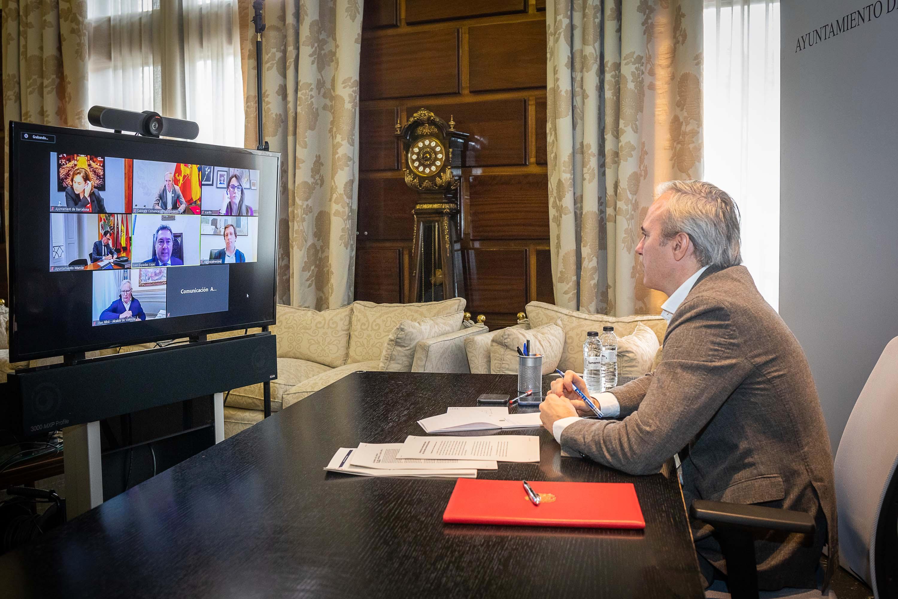 En el encuentro, que se ha realizado a petición del alcalde de Zaragoza, han participado, además de Jorge Azcón, José Luis Martínez-Almeida, Ada Colau, Joan Ribó, Juan Espadas, Susana Carillo (alcaldesa accidental de Málaga) y José Ballesta.