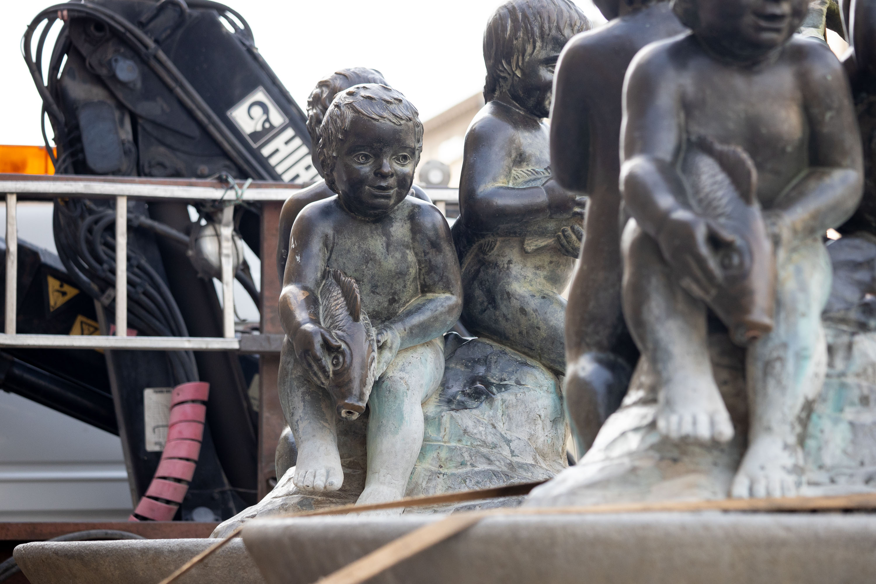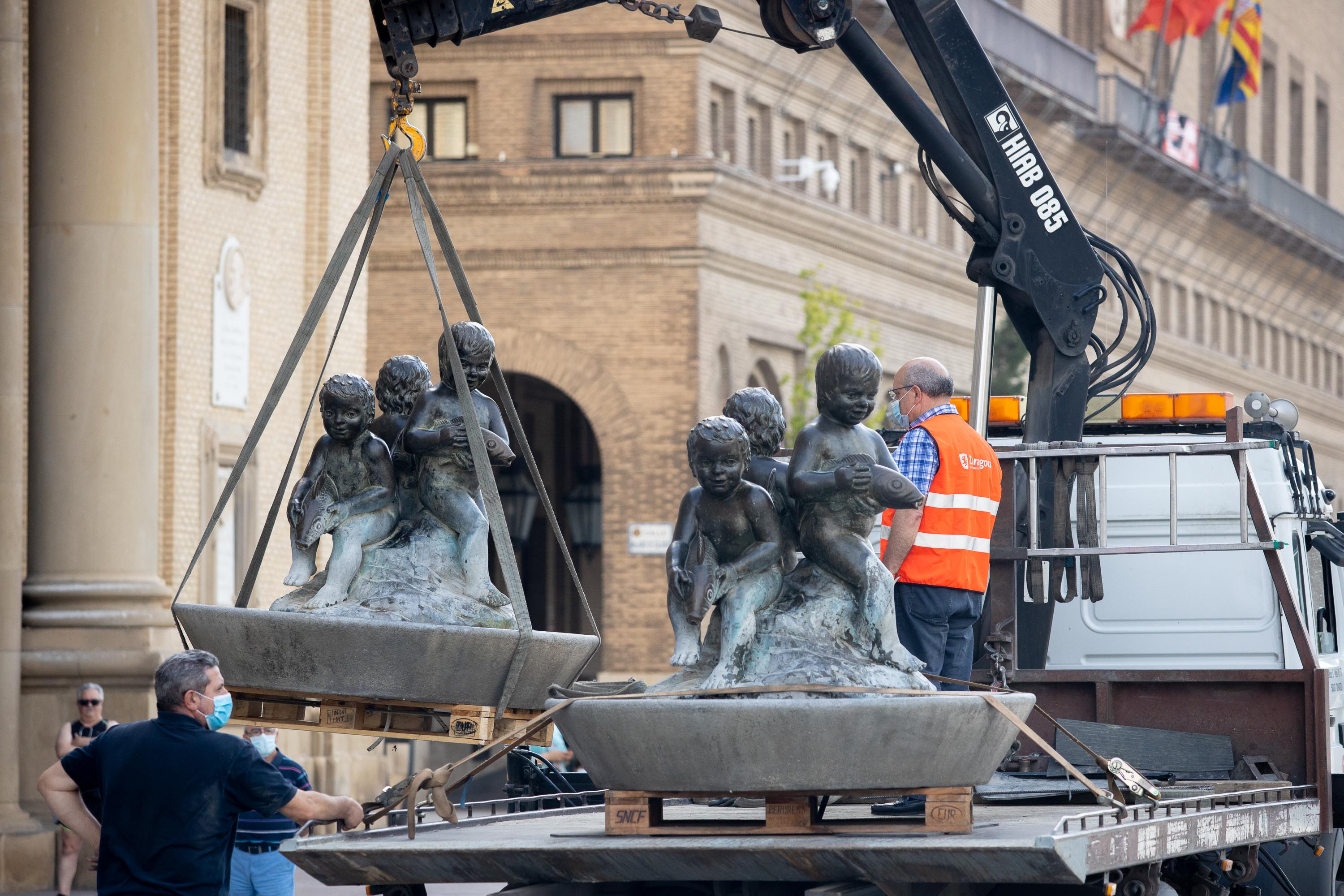 Patrimonio retira las dos fuentes Niños con peces de la Plaza del Pilar para acometer su restauración