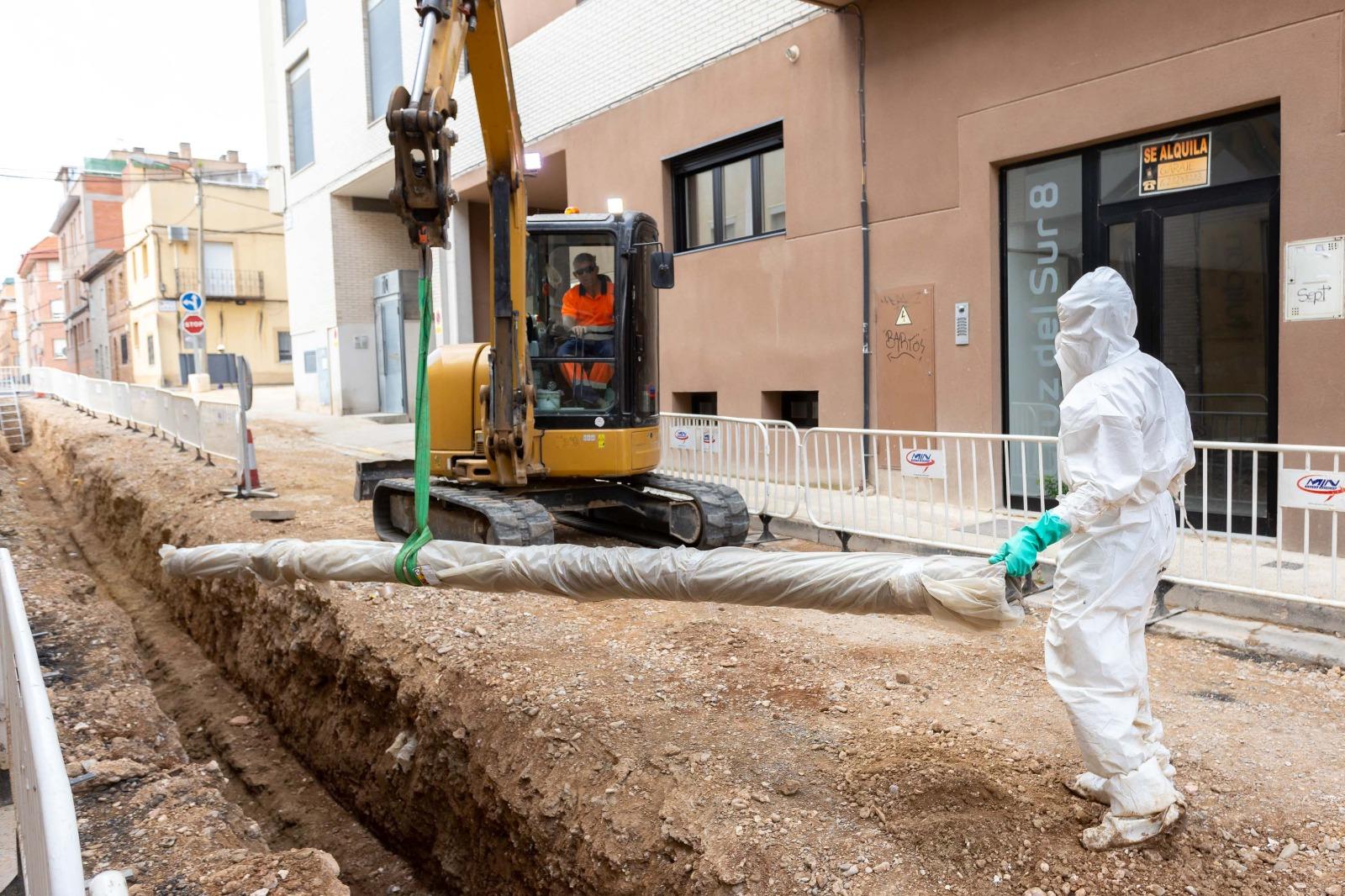 En estos momentos los trabajos se encuentran en la segunda fase, centrada en la sustitución de la tubería de abastecimiento de agua. A lo largo de esta semana se está desmontando la antigua conducción de fibrocemento y fundición gris y posteriormente se instalará una nueva de fundición dúctil de 150 mm. Además se renovarán los nudos de la red en las intersecciones de las calles Marte, Tulipán y Aries.