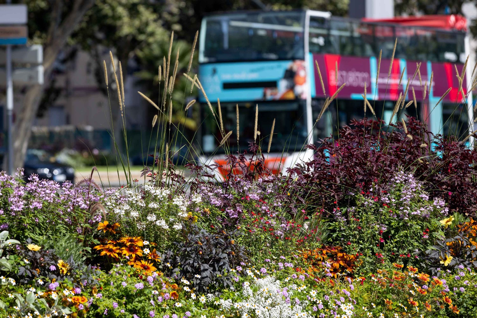 Se ha utilizado una composición floral de sutera, calibrachoa, surfinia, astiriscus, lobelia, verbena y bidens tanto en solitario, como en combinación con plantas arbustivas. En cuanto al número y tamaño de las mismas, se ha variado en función de la composición. De media se han plantado 7 esquejes de flor por jardinera en las que hay sólo flor y 10 en las que se ha mantenido o plantado un arbusto. En total se han plantado en estos maceteros 21 Photinias Red Robin, 378 plantas de flor de tamaño mediano y 280 de tamaño más pequeño.