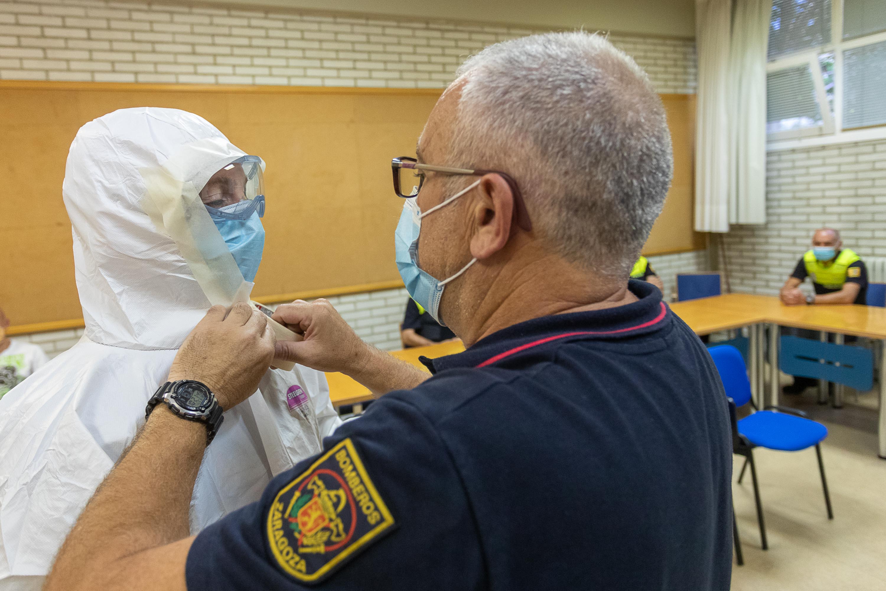 Un centenar de agentes de la Policía Local del Ayuntamiento de Zaragoza está recibiendo formación específica, impartida por los Bomberos de Zaragoza, para la utilización de trajes de protección biológica con los que realizar las funciones encomendadas en el control domiciliario del Barrio de Las Delicias, coordinado por el Gobierno de Aragón para garantizar el cumplimiento del confinamiento.