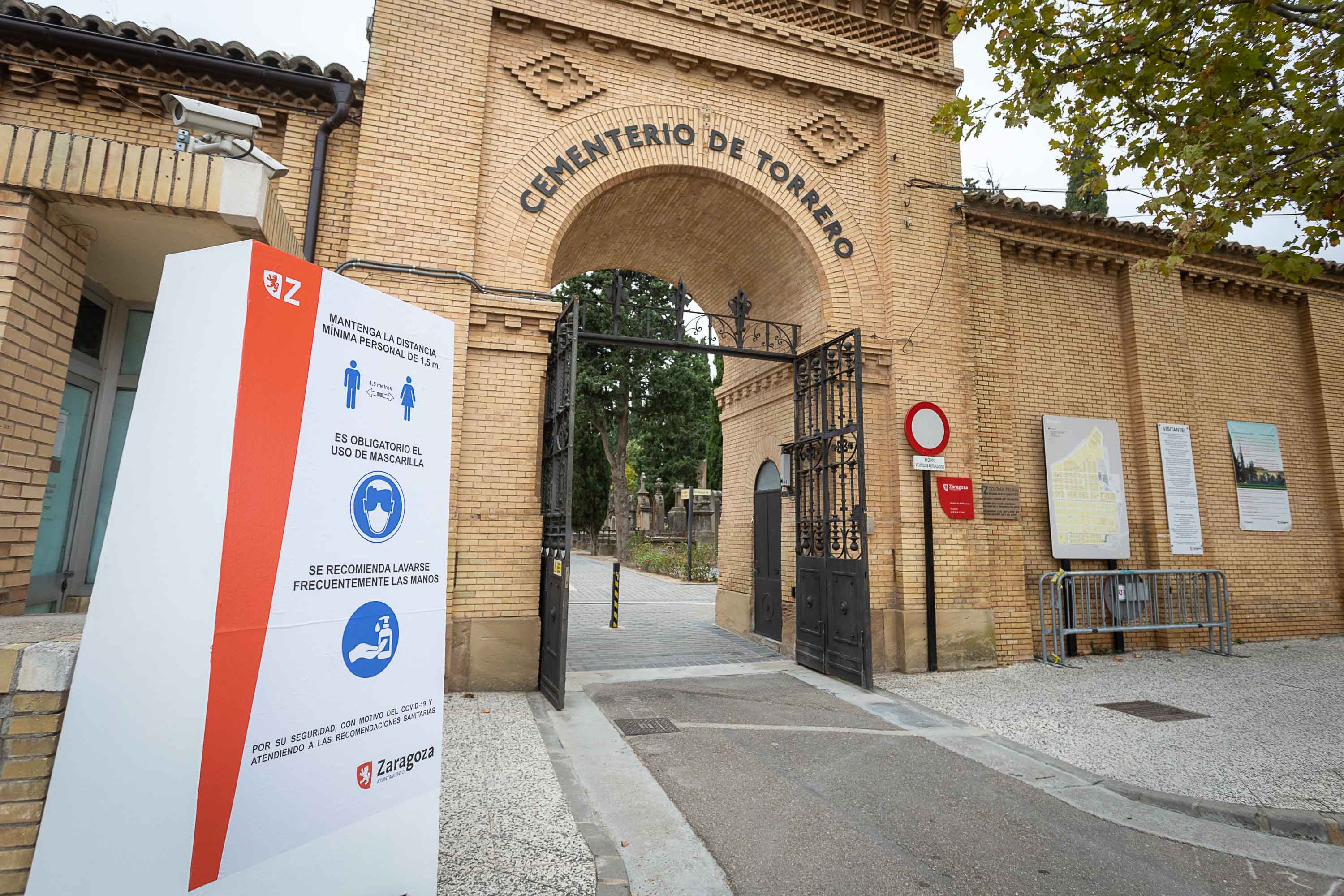 El horario de apertura del Cementerio de Torrero será desde las 8:00 hasta las 20:00 horas durante todos los días que dure el dispositivo especial de Todos los Santos. Así, entre el 24 de octubre y el 3 de noviembre se van a habilitar tres puertas peatonales, dos junto a la entrada antigua del Cementerio de Torrero, y la habitual ubicada en el acceso principal. En cada una de esas entradas se ubicarán los sistemas de conteo con los que controlar el volumen de visitantes que tiene el recinto en cada momento. El decreto fija el máximo de aforo en 6.000 personas, dejando en el 25% la capacidad de ocupación del recinto.