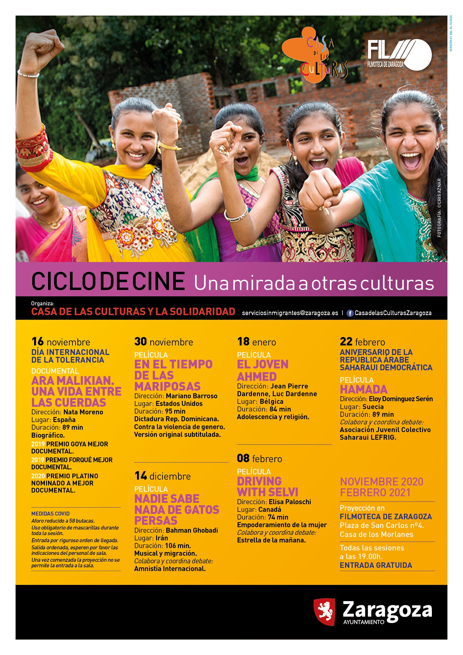 Este lunes 16 de noviembre, Día Internacional de la Tolerancia, comienza el ciclo de cine `Una mirada a otras culturas', organizado por el Ayuntamiento de Zaragoza a través de la Casa de las Culturas, que en esta edición se celebrará en la Filmoteca de Zaragoza, por sus mejores condiciones para cumplir con las medidas de prevención sanitaria.