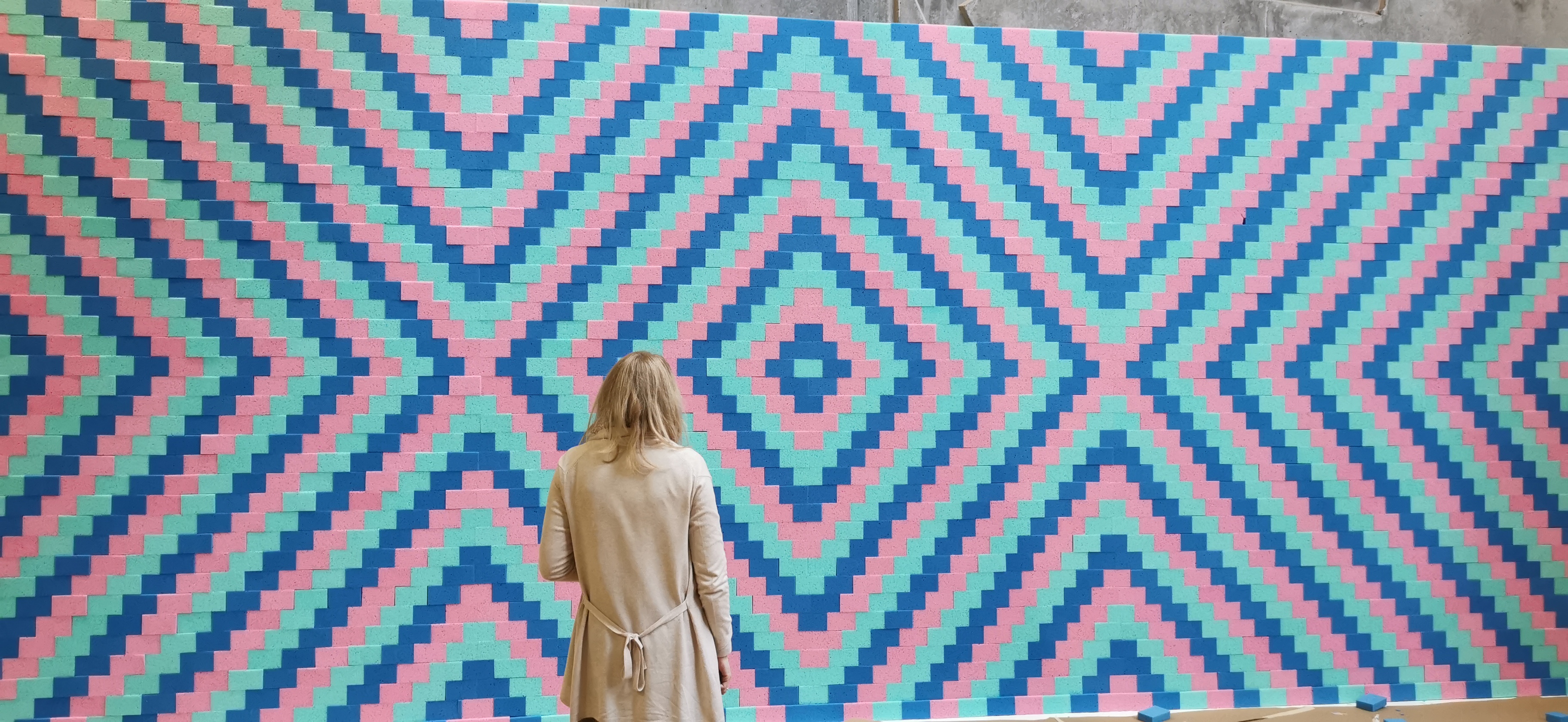 Víctor Solanas-Díaz nos presenta una nueva intervención realizada, en esta ocasión, con elementos industriales, que invitan al espectador a reflexionar sobre el espacio y su ocupación, y sobre la escala temporal y espacial que la época impone. Las estructuras creadas con sencillas esponjas de baño sintéticas -cada vez más en desuso- están pensadas para generar una serie de redes modulares que recuerdan a diversos elementos propios de edificios civiles y religiosos de épocas pasadas, donde paredes, suelos y techos tenían una decoración geométrica perfectamente estructurada, que en este caso se ha realizado siguiendo los criterios de percepción del color RGB (Red-Green-Blue).