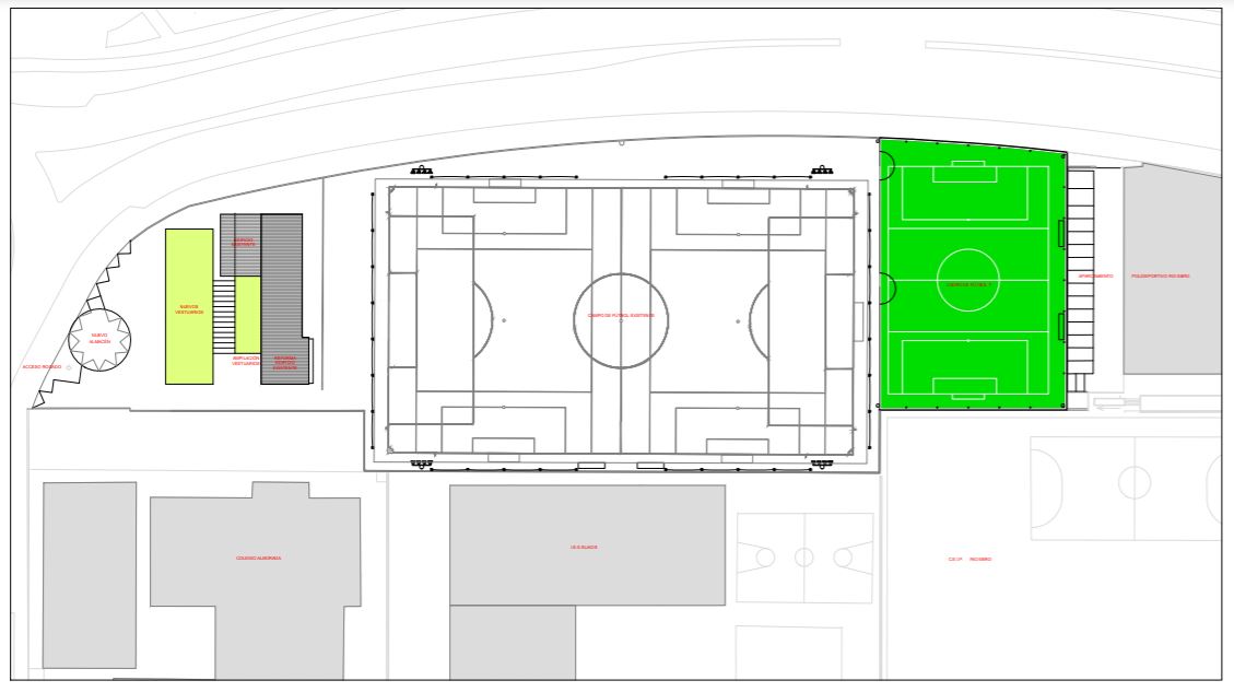 El proyecto unificará la nueva instalación con el edificio existente reorganizando el programa y atendiendo a las necesidades requeridas. Entre las actuaciones estará la agrupación de todos los vestuarios de equipos (tanto nuevos como existentes), árbitros y botiquín en un mismo entorno con una zona de distribución central protegida por una pérgola que unificará las edificaciones. También se hará una ubicación de zonas más públicas y representativas (bar, porche de bar y aula) en la zona frontal hacia el campo de fútbol 11 existente. En este aspecto, se hará un tratamiento de esta fachada con la disposición de grandes aberturas para los usos públicos y el revestimiento metálico que albergará las carpinterías correderas para poder conectar los espacios con las zonas de porche y exterior. También habrá una zona de oficinas con dos despachos diferenciados y conexión interior con la zona de aula; se reorganizarán y optimizarán los sistemas de instalaciones para climatización; y configurará nueva zona de  almacenamiento.