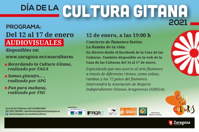 El Ayuntamiento de Zaragoza, a través de la Casa de las Culturas, celebra el Día de la Cultura Gitana (12 de enero) con una programación cultural online que se desarrollará desde este martes hasta el domingo 17 de enero, organizada en colaboración con la Asociación de Promoción Gitana, Federación de Asociaciones Gitanas `FAGA', Fundación Secretariado Gitano, Asociación Cultural `A Bajañí' - La Guitarra, Asociación Músicos de Hoy y Asociación de Mujeres Independientes Gitanas Aragonesas (AMIGA).