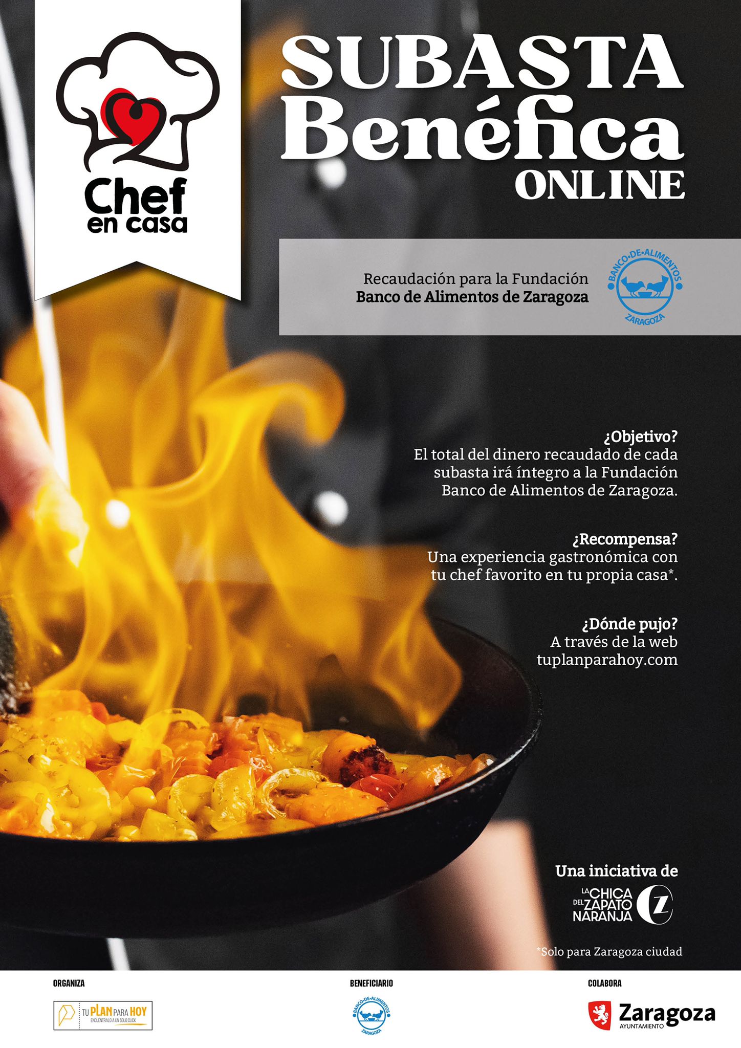 Recaudar fondos para la Fundación Banco de Alimentos de Zaragoza mediante una iniciativa solidaria protagonizada por algunos de los chefs más conocidos de la ciudad. Ese es el objetivo de "Chef en Casa", una campaña de subastas benéficas online promovida por la agencia La Chica del Zapato Naranja (LCZN) y la plataforma tuplanparahoy.com, con el apoyo del Área de Acción Social y Familia del Ayuntamiento de Zaragoza.