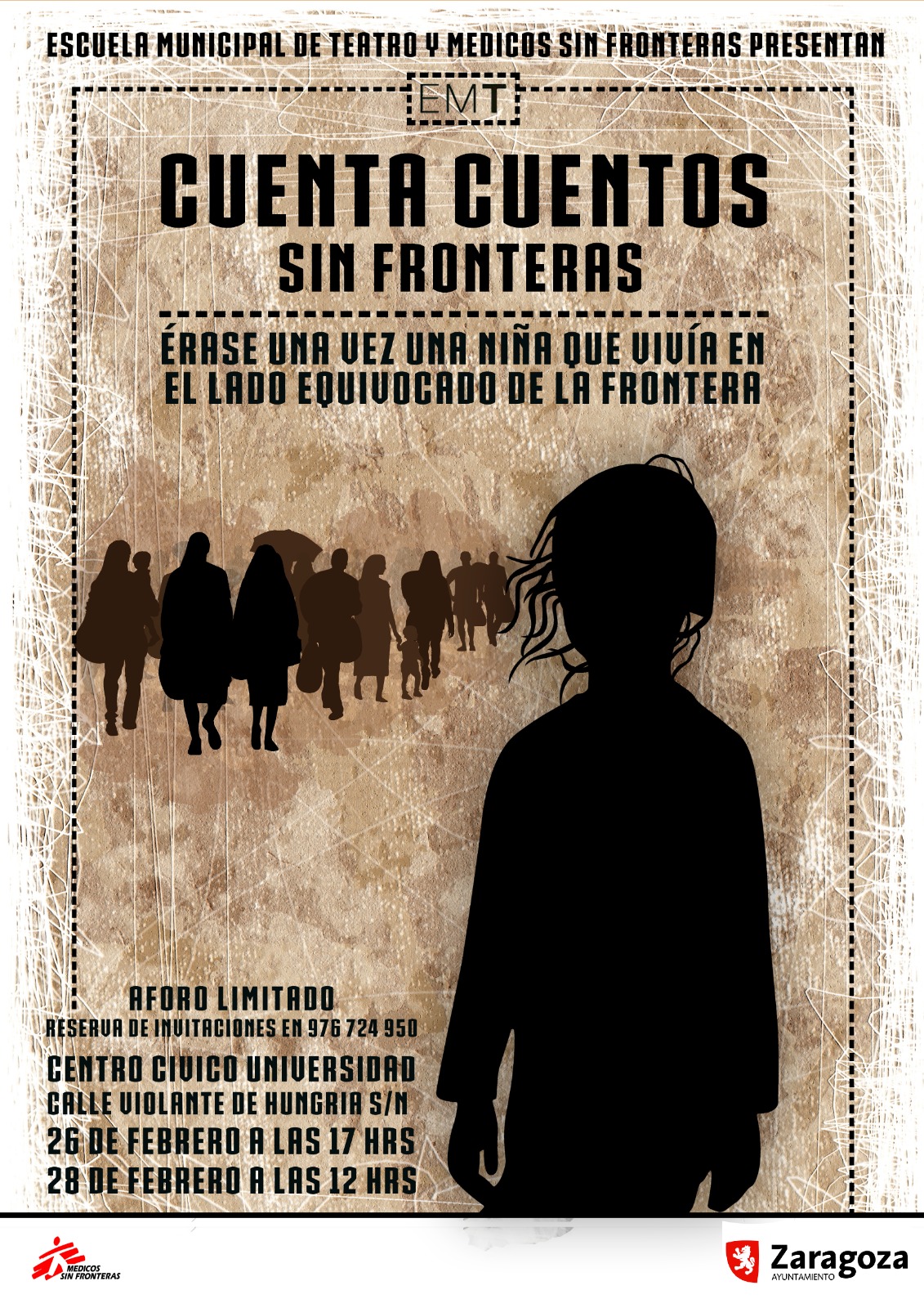 La Escuela Municipal de Teatro del Ayuntamiento de Zaragoza y la ong Médicos Sin Fronteras ofrecen esta semana el ciclo de funciones `Cuentacuentos Sin Fronteras', una iniciativa artística para concienciar sobre la dura realidad de las personas obligadas a vivir en países desolados por la guerra y la escasez o que atraviesan la tierra y el mar en busca de una vida mejor, encontrándose al llegar a Europa con una valla o un campo de refugiados.