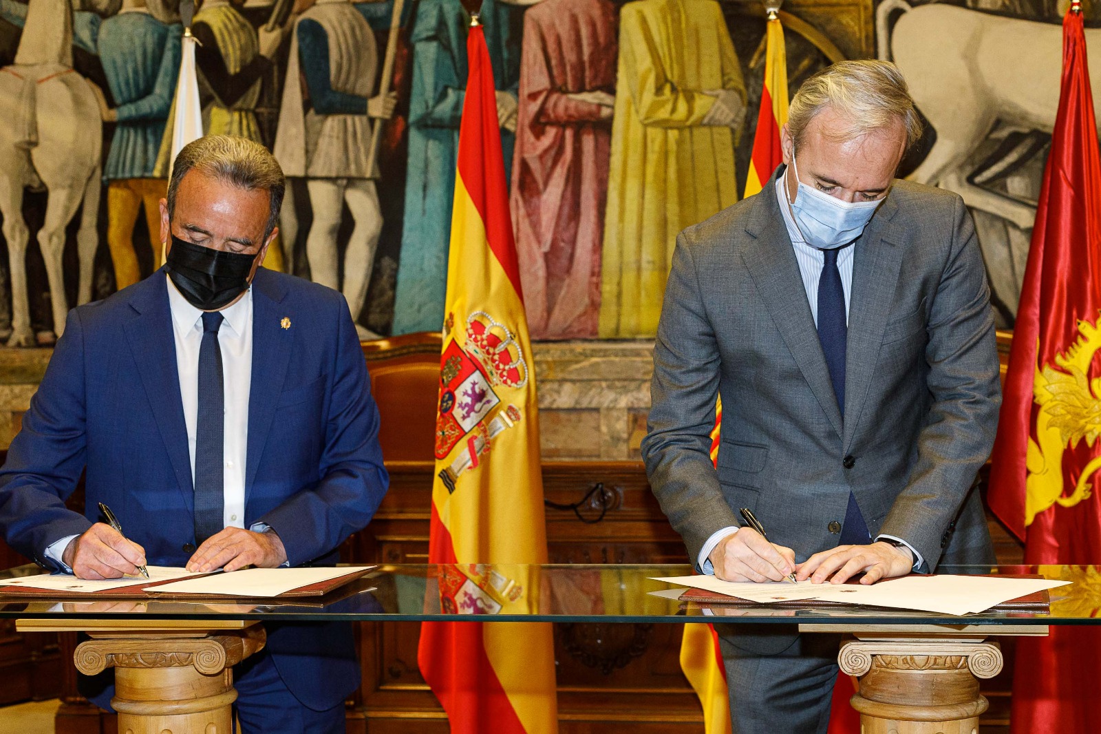 El presidente de la Diputación de Zaragoza, Juan Antonio Sánchez Quero, y el alcalde de Zaragoza, Jorge Azcón, han firmado hoy el protocolo para formalizar un nuevo convenio de colaboración en materia de equipamientos e infraestructuras en los barrios rurales de la capital aragonesa y de coordinación en la prestación de servicios para la provincia.
