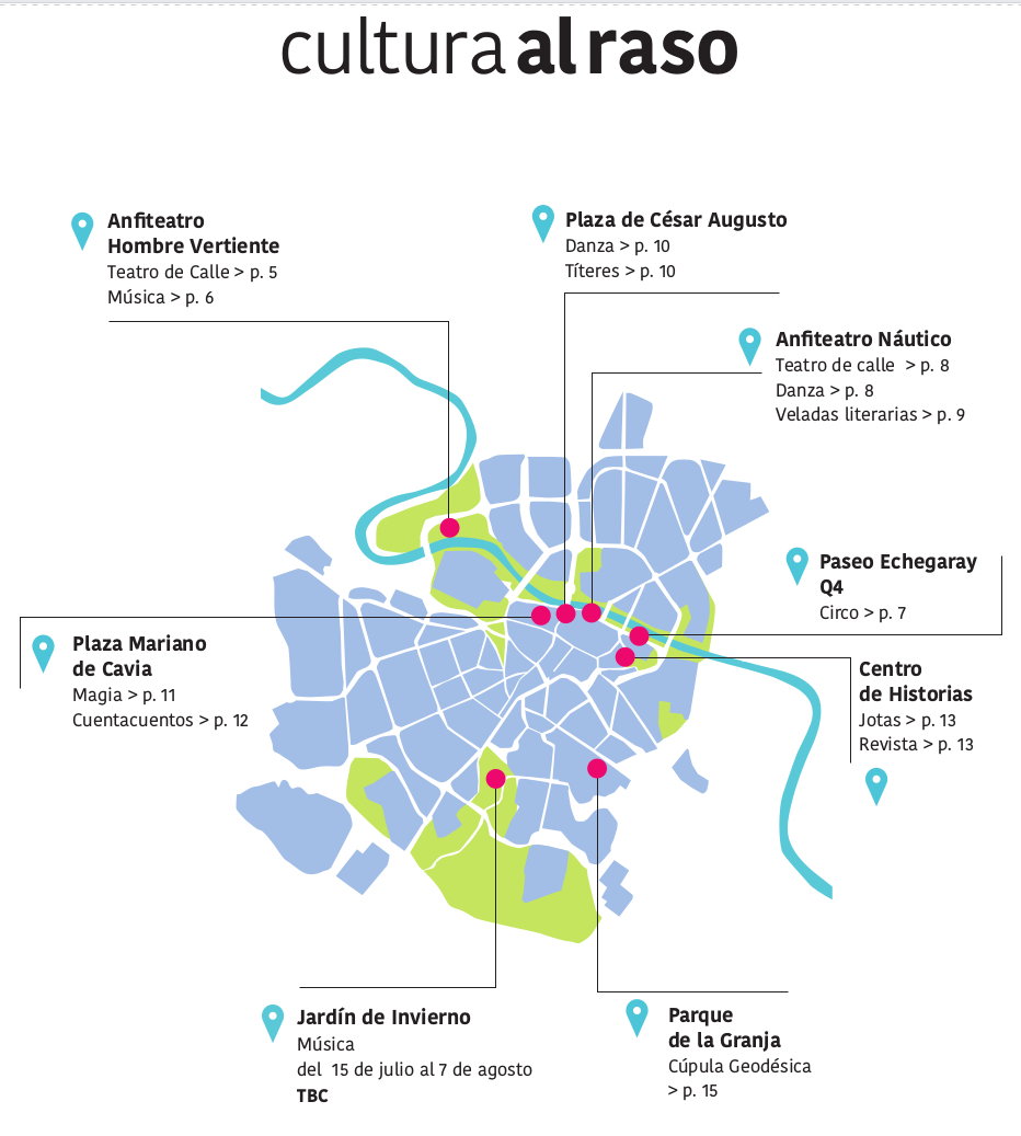 La cultura vuelve a ocupar las calles de Zaragoza con Cultura al Raso, un programa multidisciplinar que ofrece para los meses de mayo, junio y julio más de 80 actividades en 8 espacios de la ciudad al aire libre. La potente programación planteada por Zaragoza Cultural se adaptará a las medidas sanitarias y de prevención frente a la Covid-19 vigentes en cada momento, para llevar el cine, la música, el teatro, la literatura, las artes circenses, los conciertos, la magia, la danza, los títeres y la jota a los ocho recintos preparados a tal efecto: el Anfiteatro de Hombre Vertiente, en el antiguo recinto Expo; la plaza de César Augusto, en el Casco Histórico; los Anfiteatros junto al Club Naútico y al quiosco Q4 de paseo de Echegaray y Caballero, en la ribera del Ebro; el claustro del Centro de Historias; la plaza de Mariano de Cavia, en el entorno de Las Armas; el Jardín de Invierno, en el parque de José Antonio Labordeta; y la Cúpula Geodésica, en el parque de La Granja, en San José.