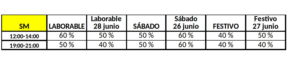 Especificados por fechas, estos paros tendrán lugar los días 29, 30 y 31 de mayo, los días 5, 6, 7, 12, 13, 14, 19, 20, 21, 26, 27 y 28 de junio, en horario de 12.00 a 14:00 horas y de 19:00 a 21:00 horas.