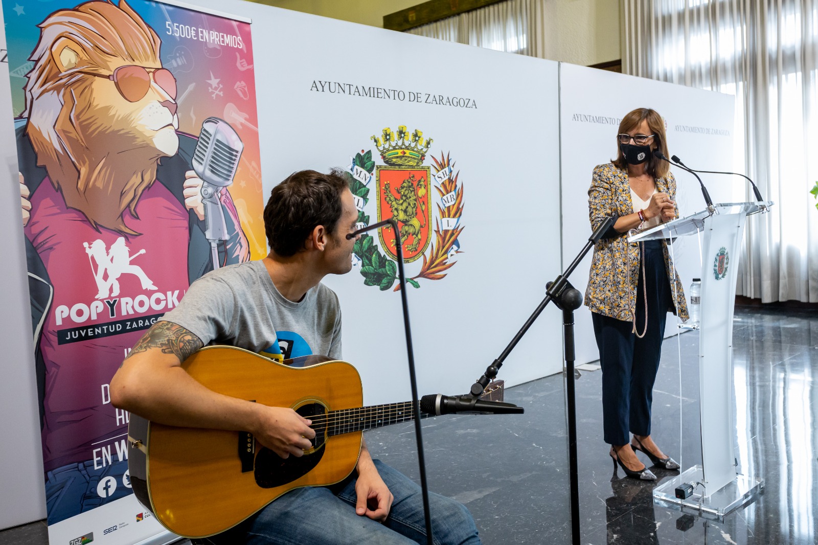 El cantante Mario Funés, ganador del concurso de 2020, ha ofrecido este jueves un anticipio de lo que será este concierto ‘Generación PopyRock’, en la presentación que ha tenido lugar este jueves en el Ayuntamiento, donde acompañado por la concejal de Juventud, María Antoñanzas, ha tocado uno de sus temas musicales.