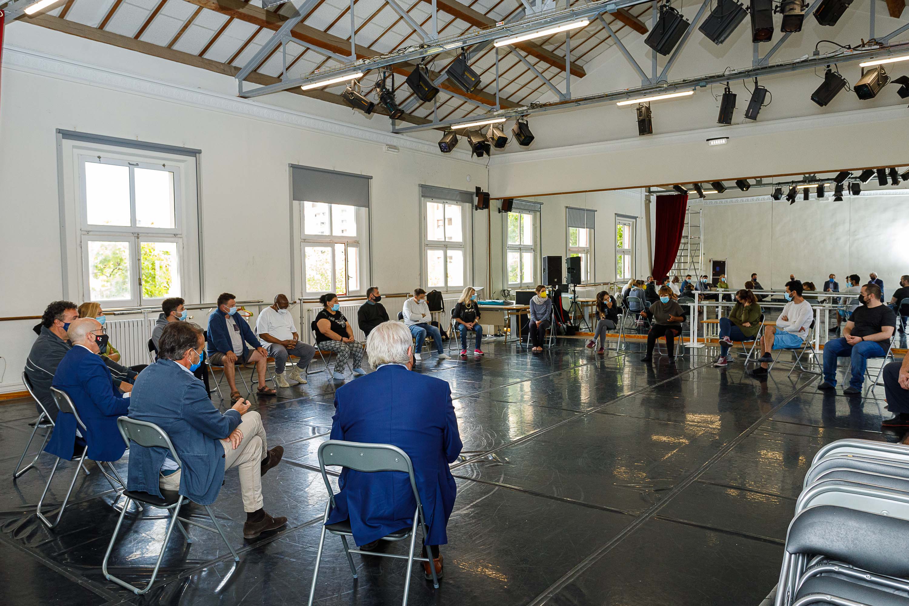 El consejero de Acción Social y Familia del Ayuntamiento, Ángel Lorén, y el responsable de Acción Social de la Territorial Ebro de CaixaBank, Javier Muñoz, junto al gerente del Patronato Municipal de Artes Escénicas y de la Imagen, José María Turmo, han visitado hoy el ensayo de este taller teatral, en las instalaciones del Centro de Danza de Zaragoza. El proyecto contó con una gran acogida en su estreno sobre el escenario, en marzo de 2020, y en febrero de 2021 en el Teatro del Mercado, con la obra ‘Nadie’.