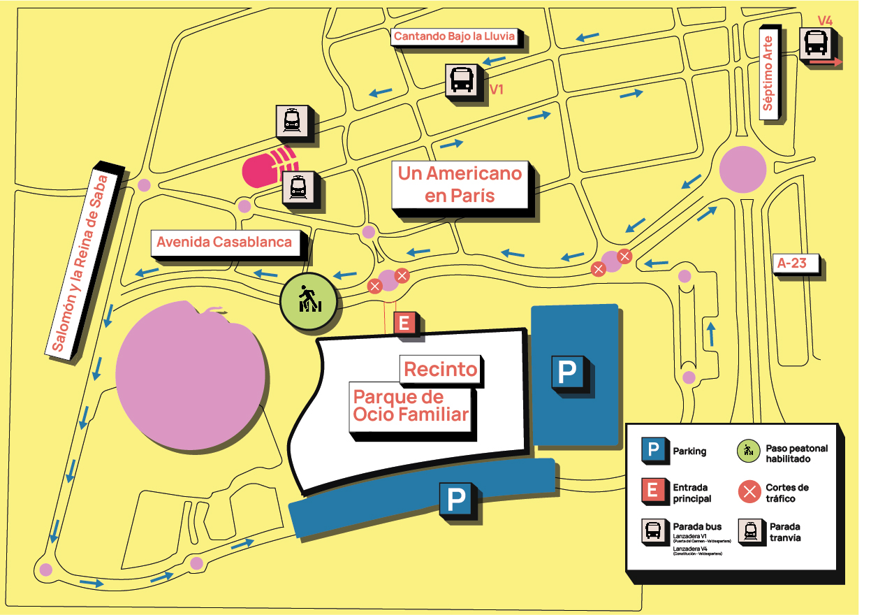Las dos paradas más próximas a este Parque de Ocio Familiar son Mago de Oz (preferentemente) y Un Americano en París. Se recuerda, en todo caso, que una vez fuera del tranvía (o camino del mismo) es necesario circular por la acera y hacer uso de los pasos de peatones en los cruces de calzada.