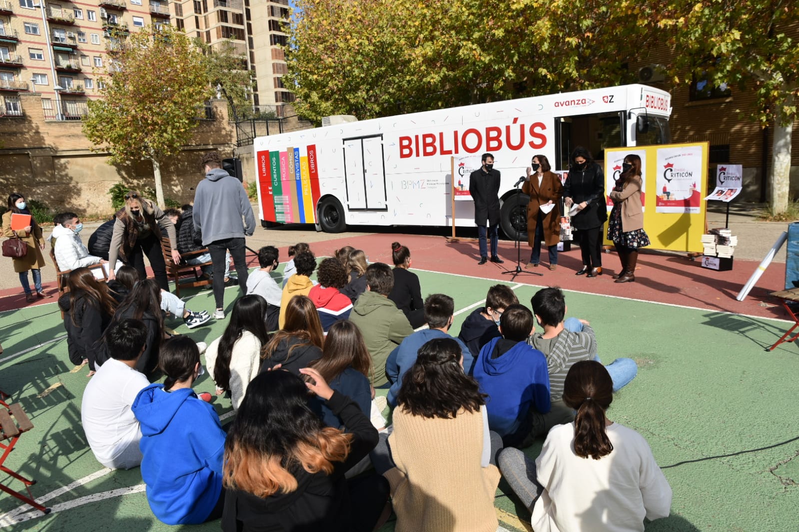 Decenas de estudiantes del IES Miguel Catalán han tenido hoy la oportunidad de conocer esta iniciativa, en este caso a través del bibliobús, que se ha desplazado a este centro educativo en un acto que ha contado con la asistencia de la vicealcaldesa y consejera de Cultura, Sara Fernández, y la concejala de Educación, Paloma Espinosa.