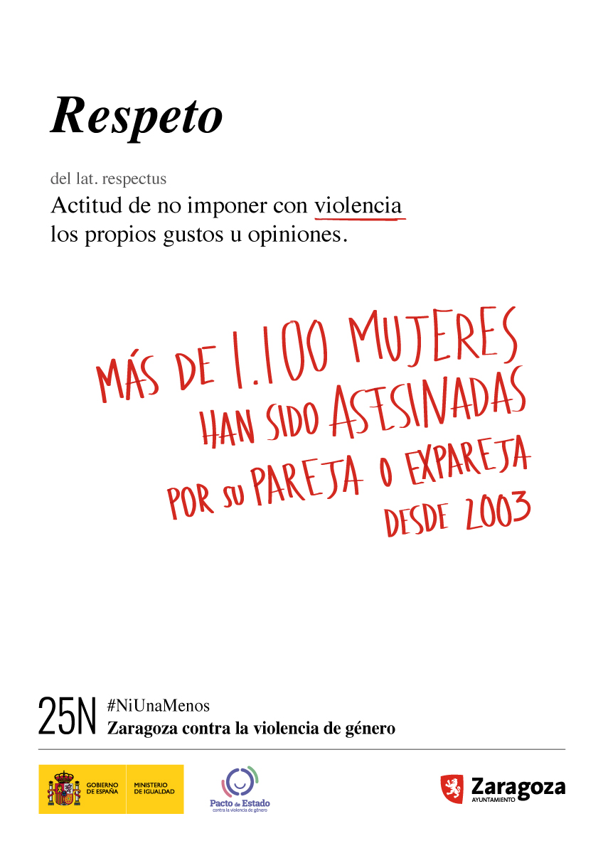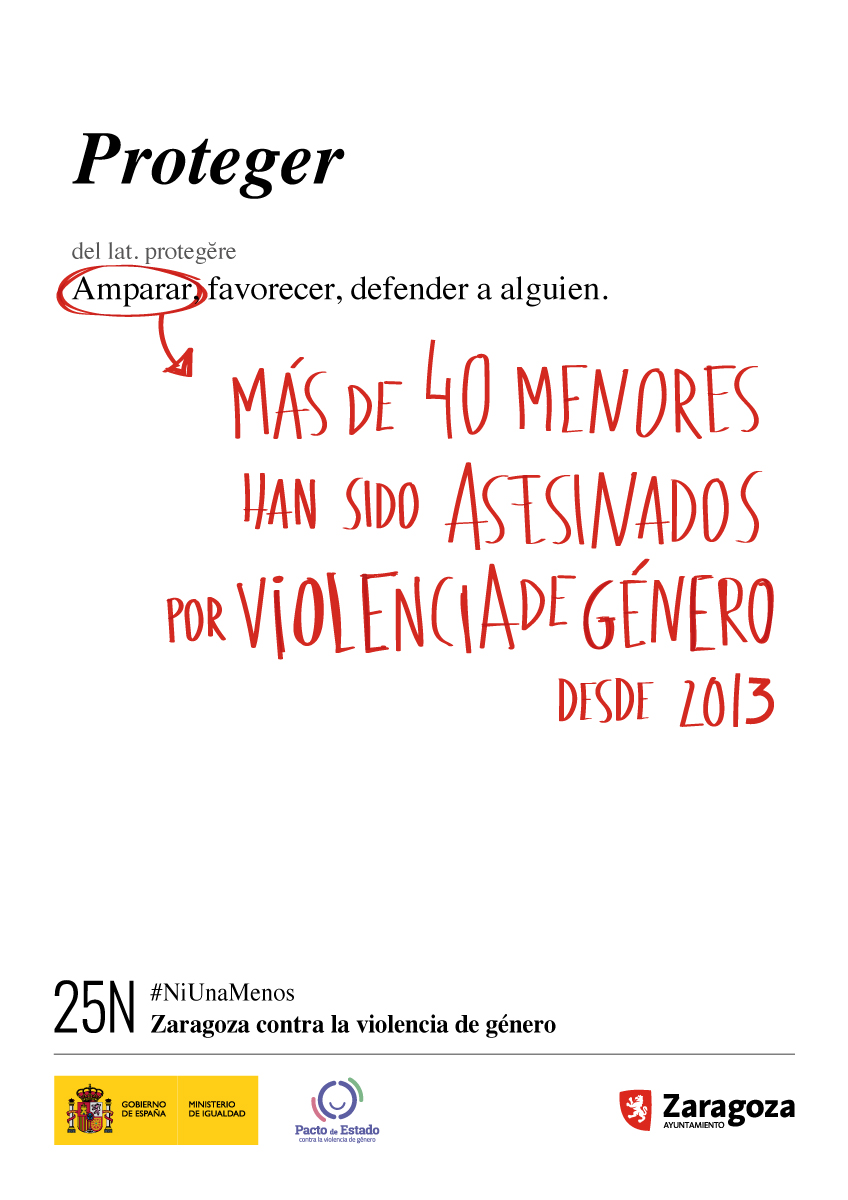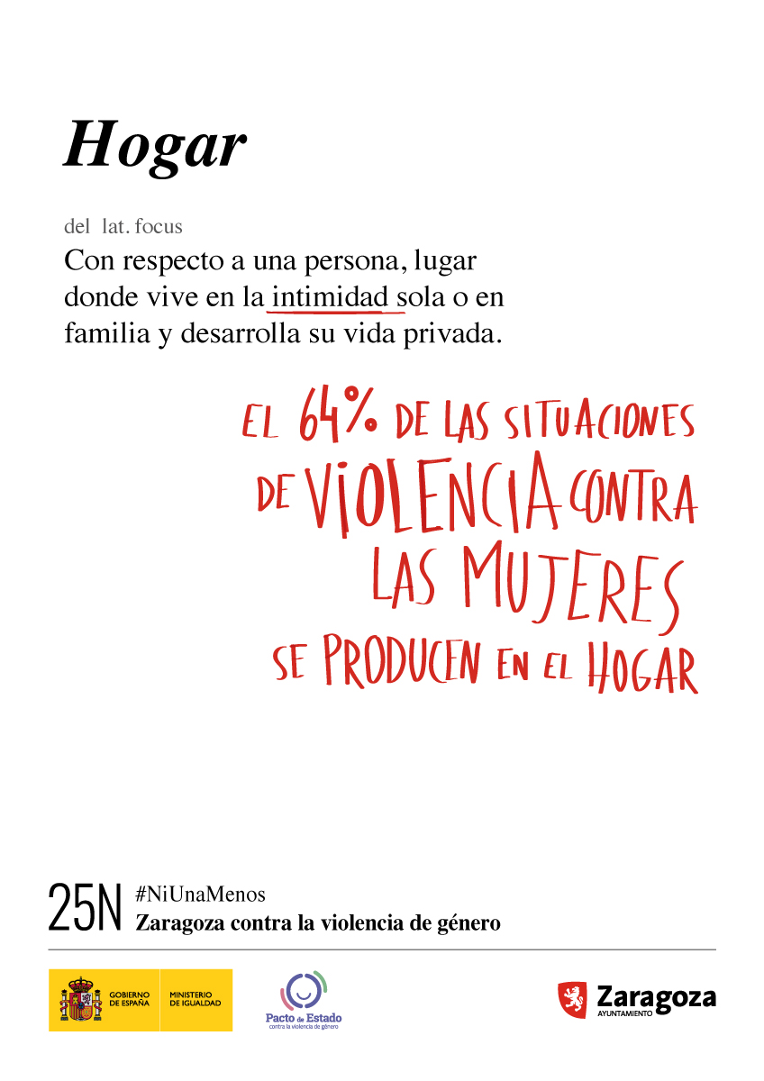 Estos nuevos conceptos son hogar, proteger y respeto, definiciones que van acompañadas de datos para destacar que el 64 % de las situaciones de violencia contra las mujeres se producen en el hogar o que más de 40 menores han sido asesinados por violencia de género desde 2013. Todo ello enmarcado en el lema de la ciudad para el 25 N, ‘Zaragoza contra la violencia de género’ y el hashtag ‘Ni una menos’, que un año más completan el mensaje.