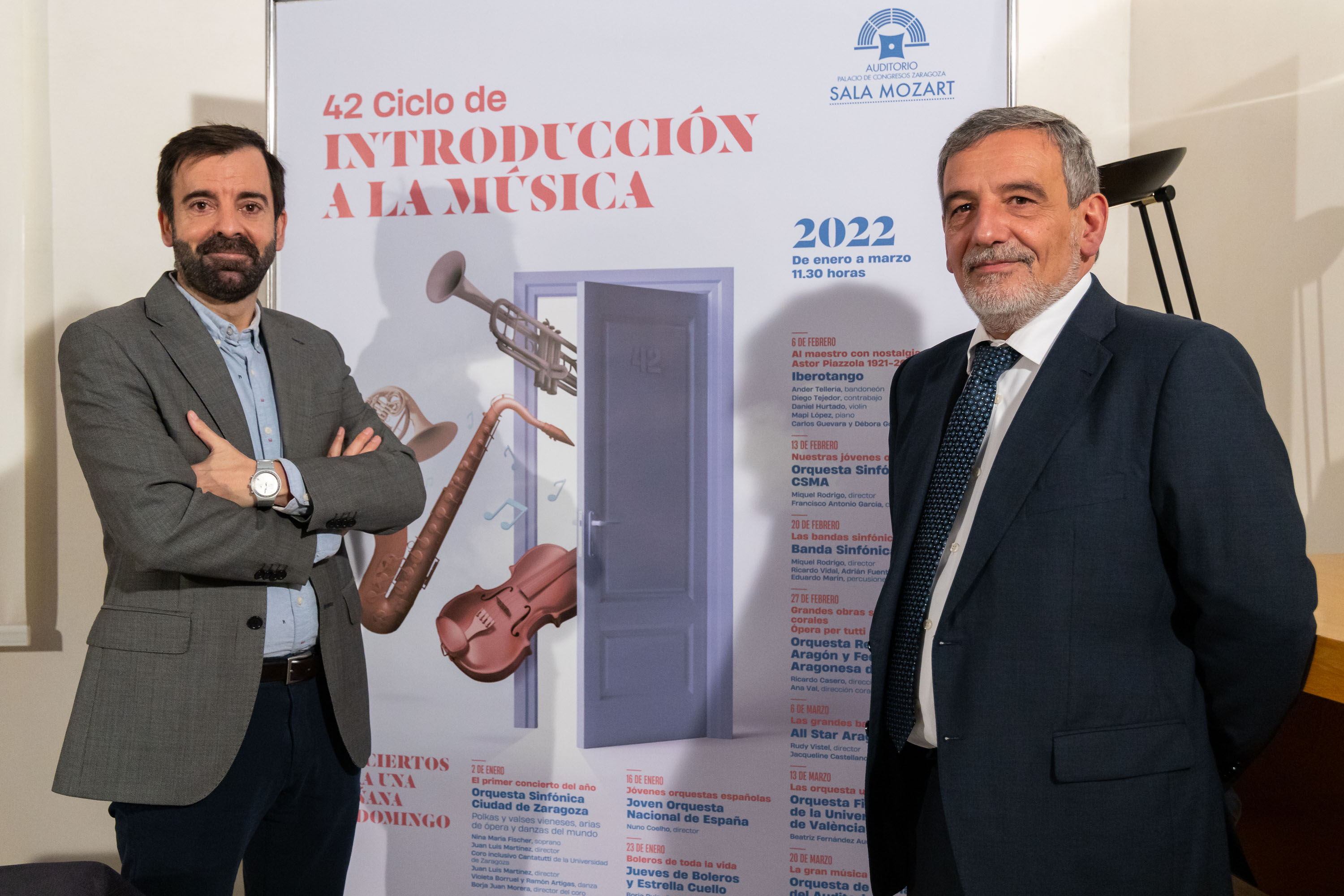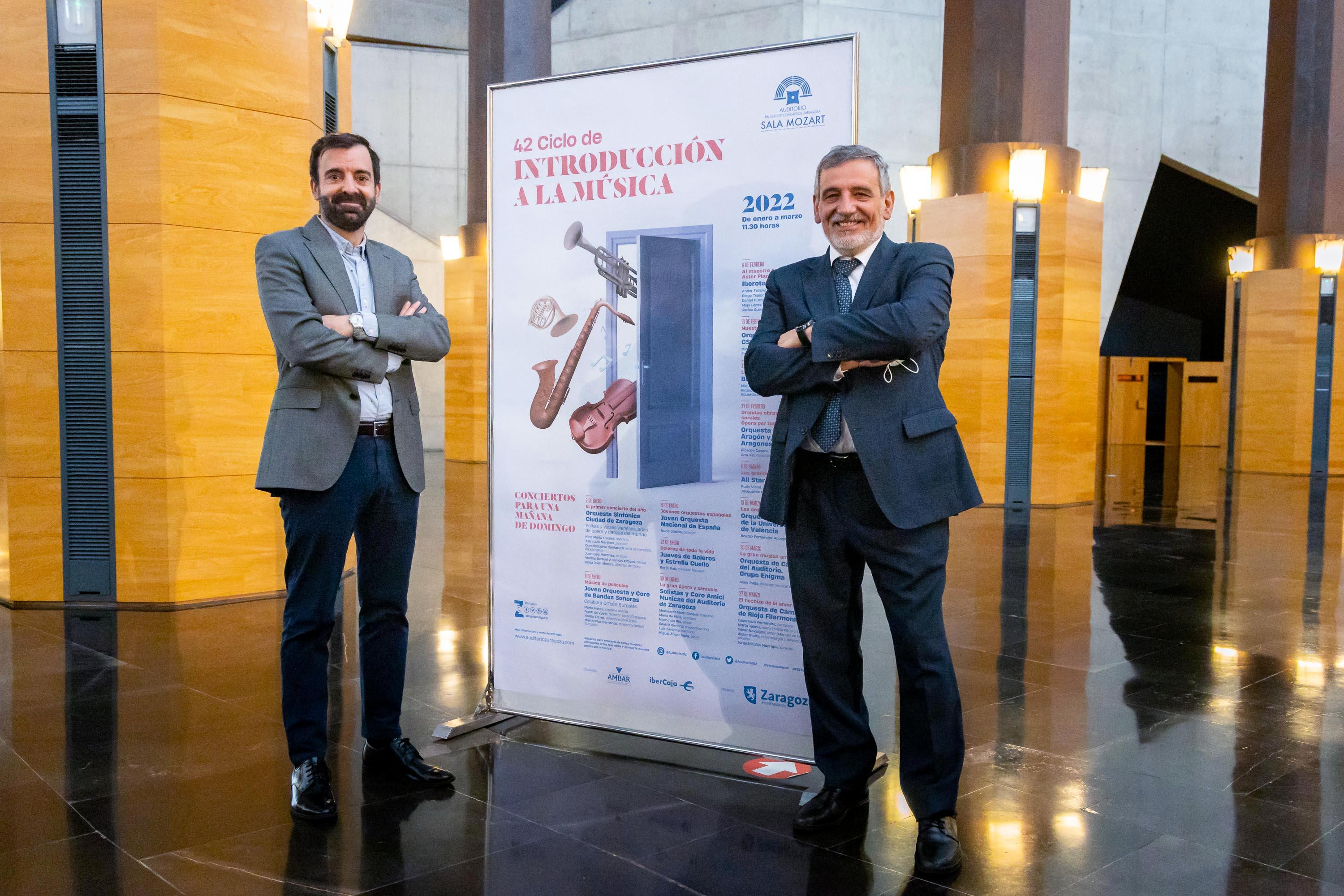 El Auditorio de Zaragoza abrirá sus puertas al 42 Ciclo de Introducción a la Música con un total de trece conciertos para una mañana de domingo y cargo de destacadas formaciones nacionales y locales, que harán disfrutar a los asistentes de enero a marzo de 2022. El gerente de la Sociedad Zaragoza Cultural, David Lozano, y Jesús Ángel González, Relaciones Institucionales del Auditorio, han presentado esta mañana la programación prevista, que abordará casi todos los géneros con el objetivo de acercar la música clásica a todos los ciudadanos y ciudadanas.