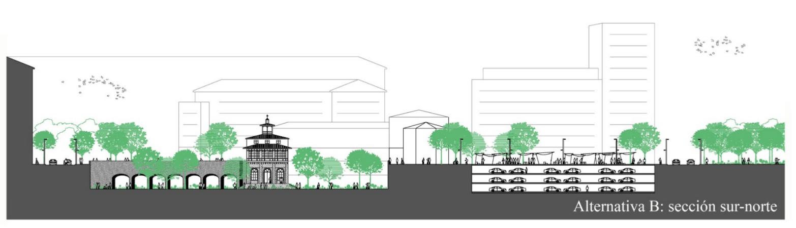 A su lado estará la plaza pública situada entre las calles de Belchite, María de Aragón y Tomás Higuera tendrá una superficie de 3.658 m² y se prevé la construcción bajo la rasante de un estacionamiento público de al menos tres plantas. Por lo que se refiere a las plazas de estacionamiento, se cuenta también con la banda sur de la calle de Tomás Higuera y las norte y este de Castillo de Javier. Dado el déficit de estacionamientos en el barrio de Las Fuentes, se ha estudiado también la distribución y posibilidades de este nuevo ordenamiento. La gran plaza exterior contaría con una capacidad para unos 400 vehículos en el parquin público enterrado a lo que se sumarían la dotación obligatoria situada en tres sótanos bajo la manzana residencial A, por lo que se tendría un total de 610 a 710 plazas que podrían destinarse a residentes en otras viviendas del barrio y que contribuirían a reducir este fuerte déficit de estacionamientos.