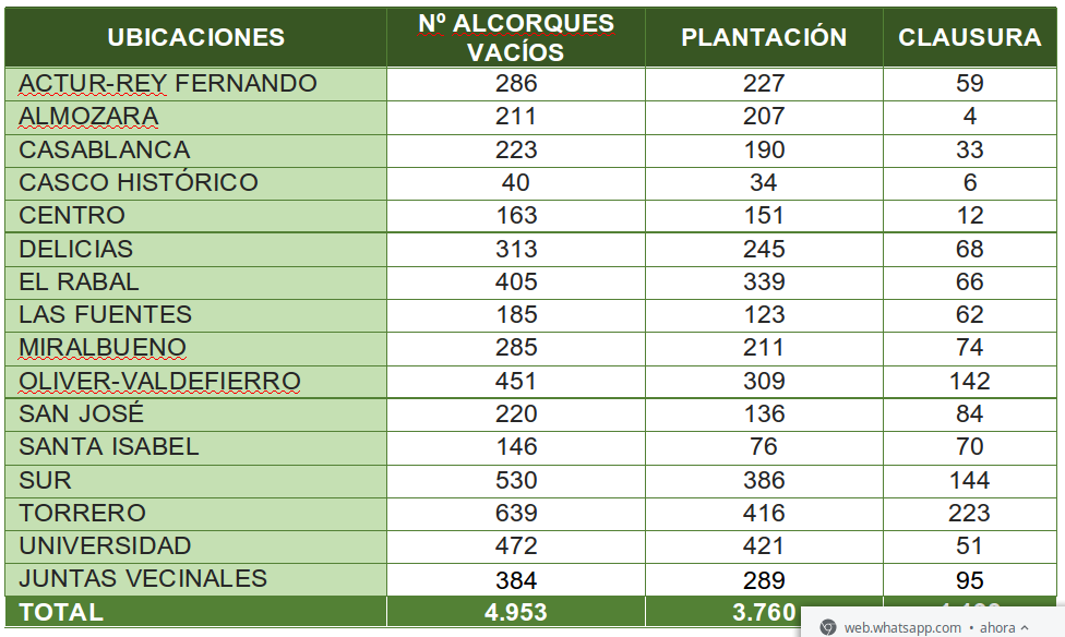 El objetivo principal del Plan de Plantación de Arbolado Viario en Alcorques Vacíos 2022-2023 es evitar la presencia de alcorques vacíos en el viario de la ciudad de Zaragoza, proponiendo una solución a cada uno de los 4.953 alcorques de viario vacíos identificados y geolocalizados.