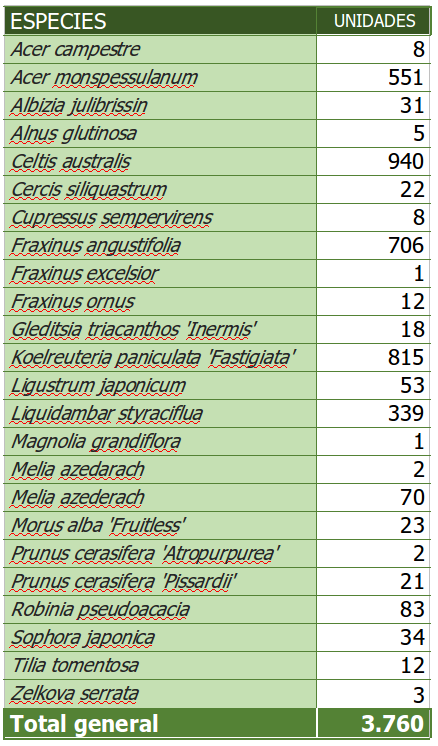 Para plantar los 3.760 árboles citados se han seleccionado un total de 24 especies arbóreas distintas, siendo el número de ejemplares a plantar de cada una de ellas, por orden alfabético, el siguiente: