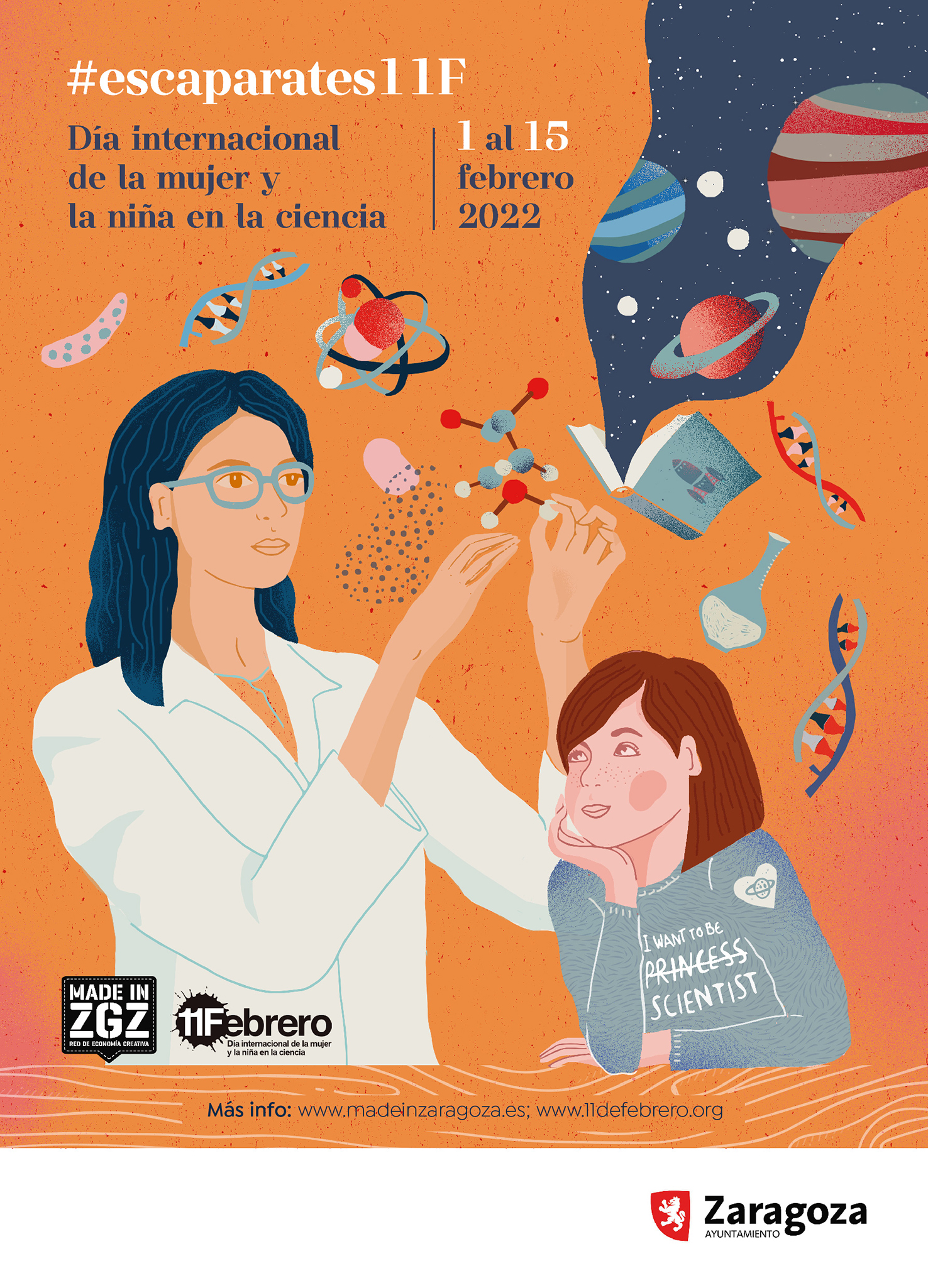 Los escaparates de 58 comercios de la red de economía creativa Made in Zaragoza se llenan desde el 1 de febrero hasta el 15 de febrero de mujeres científicas, pioneras en los campos de la astrofísica, astronomía, biología, botánica, física, geología, ingeniería, matemáticas, medicina, veterinaria, oceanografía y química. La iniciativa, nacida  de la colaboración entre Made in Zaragoza y la iniciativa 11Febrero, servirá para conmemorar el Día Internacional de la Mujer y la Niña en la Ciencia. La propuesta, que ha cumplido cuatro años, tiene tiene como objetivos conseguir una mayor participación y progreso de las mujeres y las niñas en la ciencia, así como apoyar al comercio de proximidad más creativo e innovador de Zaragoza.