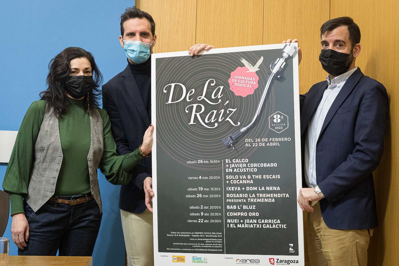 El consejero de Participación y Relación con los Ciudadanos, Javier Rodrigo, y el gerente de Zaragoza Cultural, David Lozano, han presentado el cartel de artistas, junto a Carolina Hernández, en representación de la coordinadora del ciclo Aragonesa de Representaciones Artísticas (AREA).