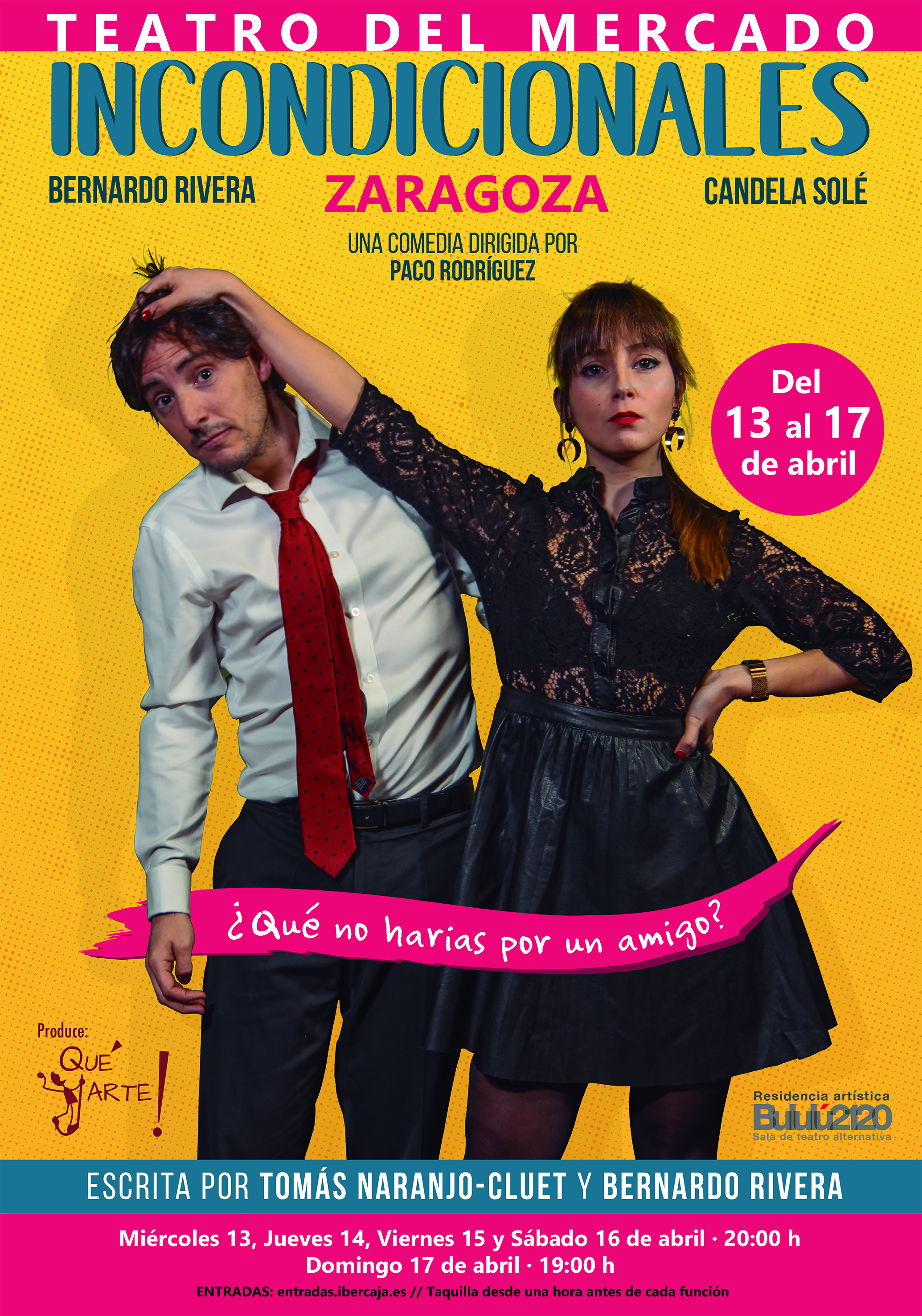 Del 13 al 17 de abril el Teatro del Mercado abre las puertas al espectáuclo “Incondicionales”, dirigida por Paco Rodríguez e interpretada por Fernando Rivera y Candela Solé. Todo el tratamiento de la obra es desde la comedia, buscando la complicidad con el público y haciéndole partícipe de las situaciones que vivirán sus protagonistas. Una comedia romántica con tintes de crítica social.