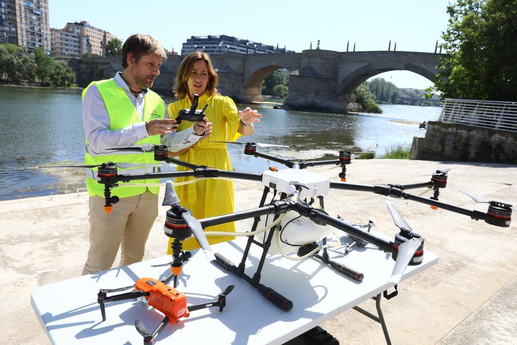 Como sucede con cada vez mayor frecuencia cuando pieza el calor -ha explicado Natalia Chueca-, se ha empezado a detectar presencia de larvas en el Ebro, así como ejemplares de mosca negra en las proximidades del río. Desde el área de Servicios Públicos -ha añadido- estamos poniendo todos los medios a nuestro alcance para limitar las afecciones que estas plagas y cualquier otra, como las garrapatas, que también hemos estado tratando estos días en distintos parques, puedan provocar en la ciudadanía, y no dudamos, como es el ejemplo de hoy, en utilizar la tecnología más avanzada para ello”.
