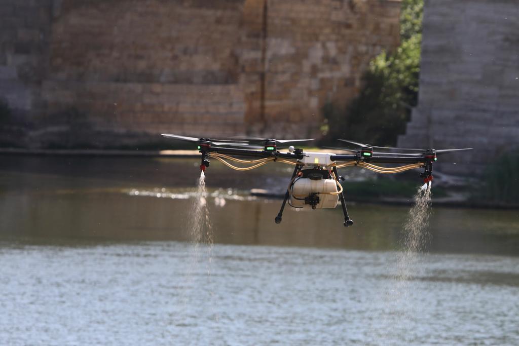 El Área de Servicios Públicos y Movilidad del Ayuntamiento, a través del Instituto Municipal de Salud Pública, ha vuelto a reforzar este año los tratamientos contra la mosca negra con la utilización de drones. Estos vehículos no tripulados, que utilizaron por primera vez el pasado año, ayudarán a esparcir el larvicida necesario en aquellos puntos del río donde es complicado acceder con barca o donde no llega el tratamiento habitual con las motobombas.