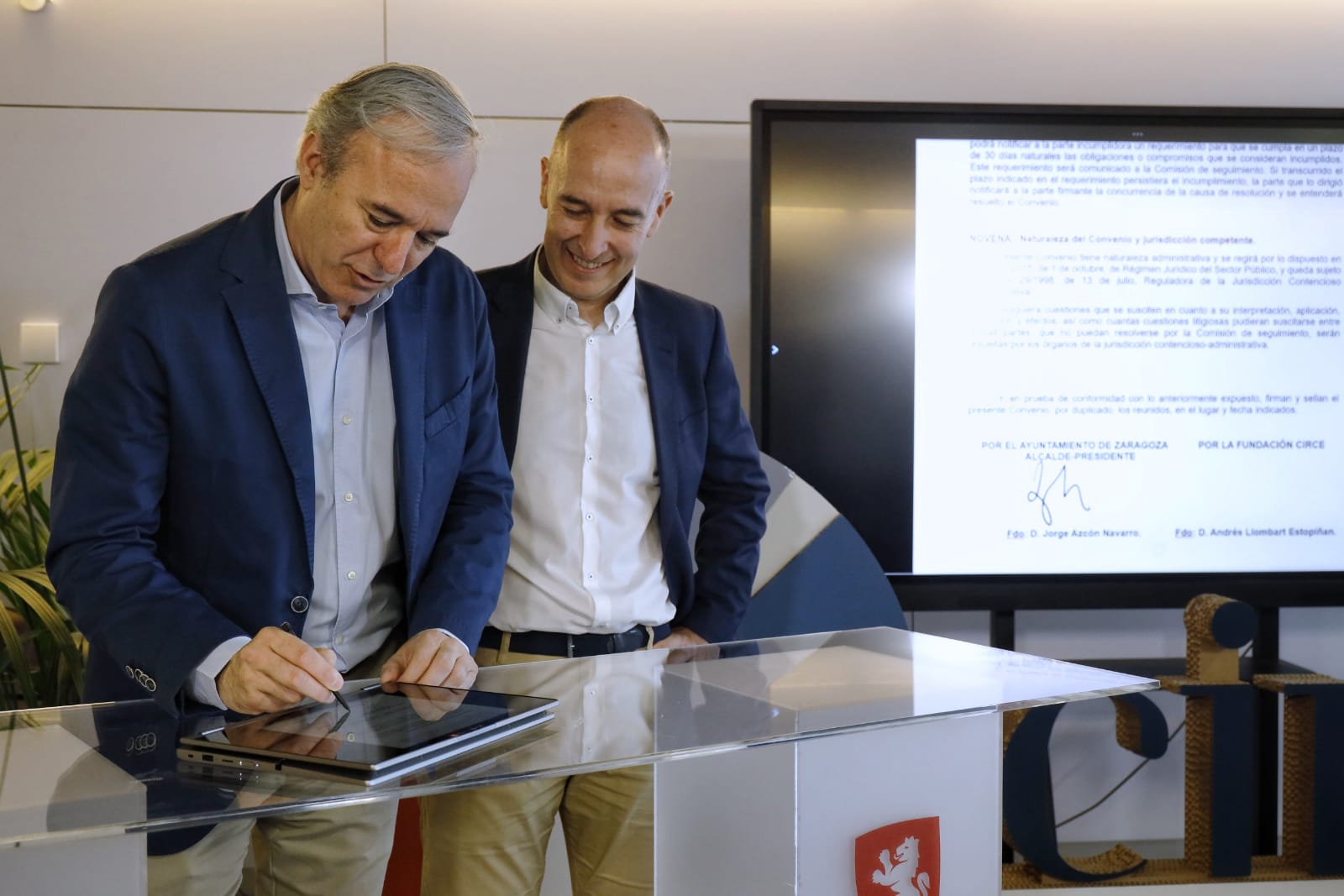 El alcalde Jorge Azcón y el director general de CIRCE, Andrés Llombart han firmado hoy el convenio que permitirá profundizar en la colaboración que ambas partes mantienen desde 2014. El centro tecnológico ha asistido al Ayuntamiento para realizar, por ejemplo, el último inventario de emisiones y ha dado soporte técnico para armar la candidatura con la que Zaragoza ha sido seleccionada por la Comisión Europea para guiar al resto de ciudades hacia la neutralidad climática.