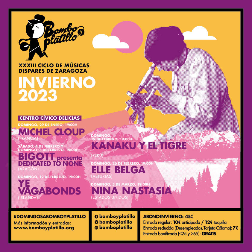 Bombo y Platillo celebrará entre los próximos 29 de enero y el 5 de marzo su edición de invierno 2023, que traerá a Zaragoza al cantante y guitarrista francés Michel Cloup y el estreno del último trabajo de Bigott. Como es habitual en sus ediciones de otoño e invierno, los conciertos se celebrarán en la rotonda de Centro Cívico de Delicias y, como siempre, su programación llega cargada de propuestas únicas y singulares. Pensado para un público sentado, en un espacio con mesas y sillas emulando los clubes de jazz, este ciclo amenizará las tardes de los domingos con un total de seis actuaciones musicales.