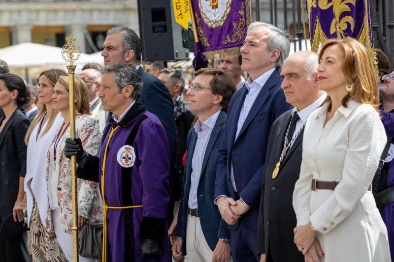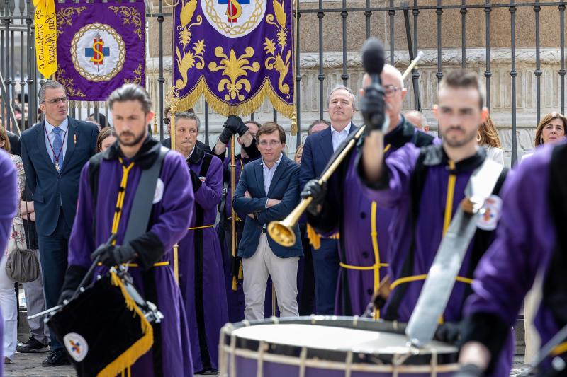 El alcalde de Madrid, José Luis Martínez-Almeida y el alcalde de Zaragoza, Jorge Azcón, han asistido a la tamborrada que tradicionalmente cierra la Semana Santa madrileña, y en la que, en esta ocasión, ha participado como invitada la Cofradía La Real, Muy ilustre y Antiquísima de la Esclavitud de Jesús Nazareno y Conversión de Santa María Magdalena de Zaragoza.