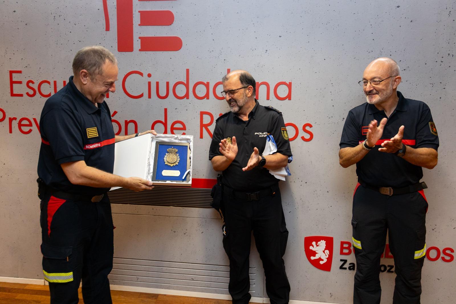 Como señal de agradecimiento, la Jefatura Superior de Policía de Aragón ha entregado una placa a Bomberos del Ayuntamiento por la "desinteresada colaboración de nuestras Unidades Operativas en actuaciones de emergencia y salvamento".
