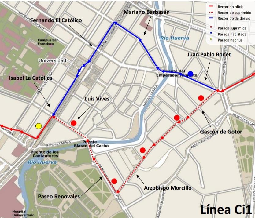 Durante la primera fase de los trabajos se cortará la calle Arzobispo Morcillo a la altura de Marina Española, quedando en fondo de saco por los dos extremos para garantizar la entrada y salida a los garajes. Será necesario además desviar la línea Ci1 del bus urbano y modificar el sentido de circulación en algunas calles aledañas para facilitar el tráfico procedente de Gascón de Gotor hacia la calle Río Huerva y de ahí a Renovales.