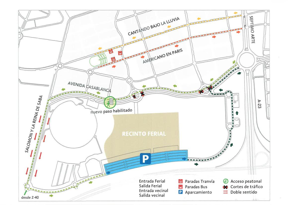 Ademas, la Avenida de Casablanca se cortará al tráfico para vehículos particulares en sentido Salomón y la Reina de Saba hacia Avenida del Séptimo Arte. El corte se situará a la altura de la entrada principal del Recinto Ferial, en la intersección de Avenida de Casablanca y Siete Samuráis. El tráfico desviado en este punto seguirá la ruta Siete Samuráis, Diligencia y Un Americano en París. Este corte estará vigente en dos períodos distintos, que serán: del 6 al 16 de octubre y del 20 al 23 de octubre.