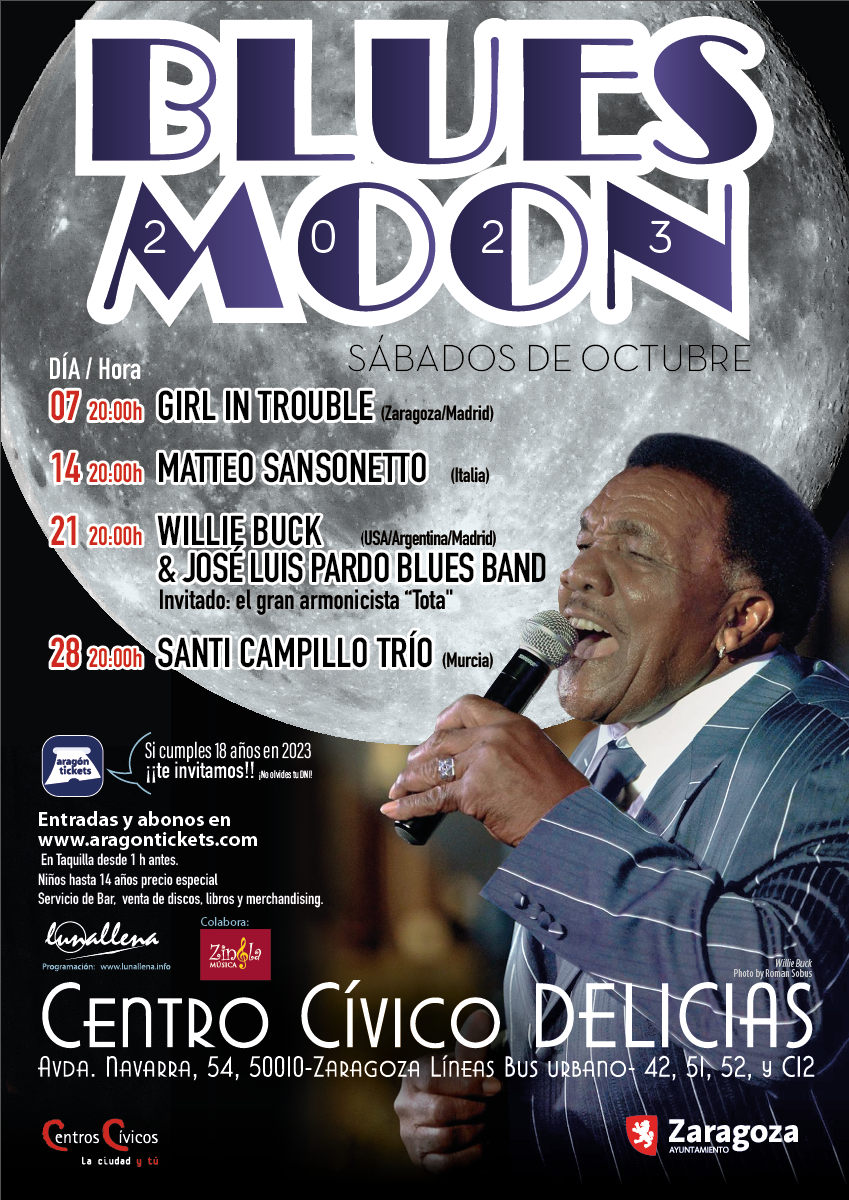 El ciclo 'Blues moon' llega este mes de octubre al centro cívico Delicias, que una vez más abrirá sus puertas a las mejores bandas del país y a otras procedentes de Estados Unidos o Argentina. 'Girl in trouble', Matteo Sansoneto, Willie Buck&Jose Luis Pardo Blues Band y Santi Campillo actuarán los sábados del mes de octubre en la rotonda de Delicias a partir de las 20.00 horas.