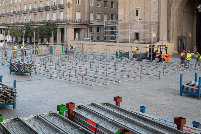 Esta mañana ha comenzado el montaje, en la plaza del Pilar, de la estructura piramidal de la Ofrenda de Flores del 12 de octubre, integrada por seis pisos o niveles y que tiene una medida en torno a los 15,50 metros de altura. La planta es rectangular, siendo sus dimensiones de 16,70 m. X 27,03 m. y pesa unas 40 toneladas. La estrcutura puede acoger aproximadamente 7.000.000 de flores.