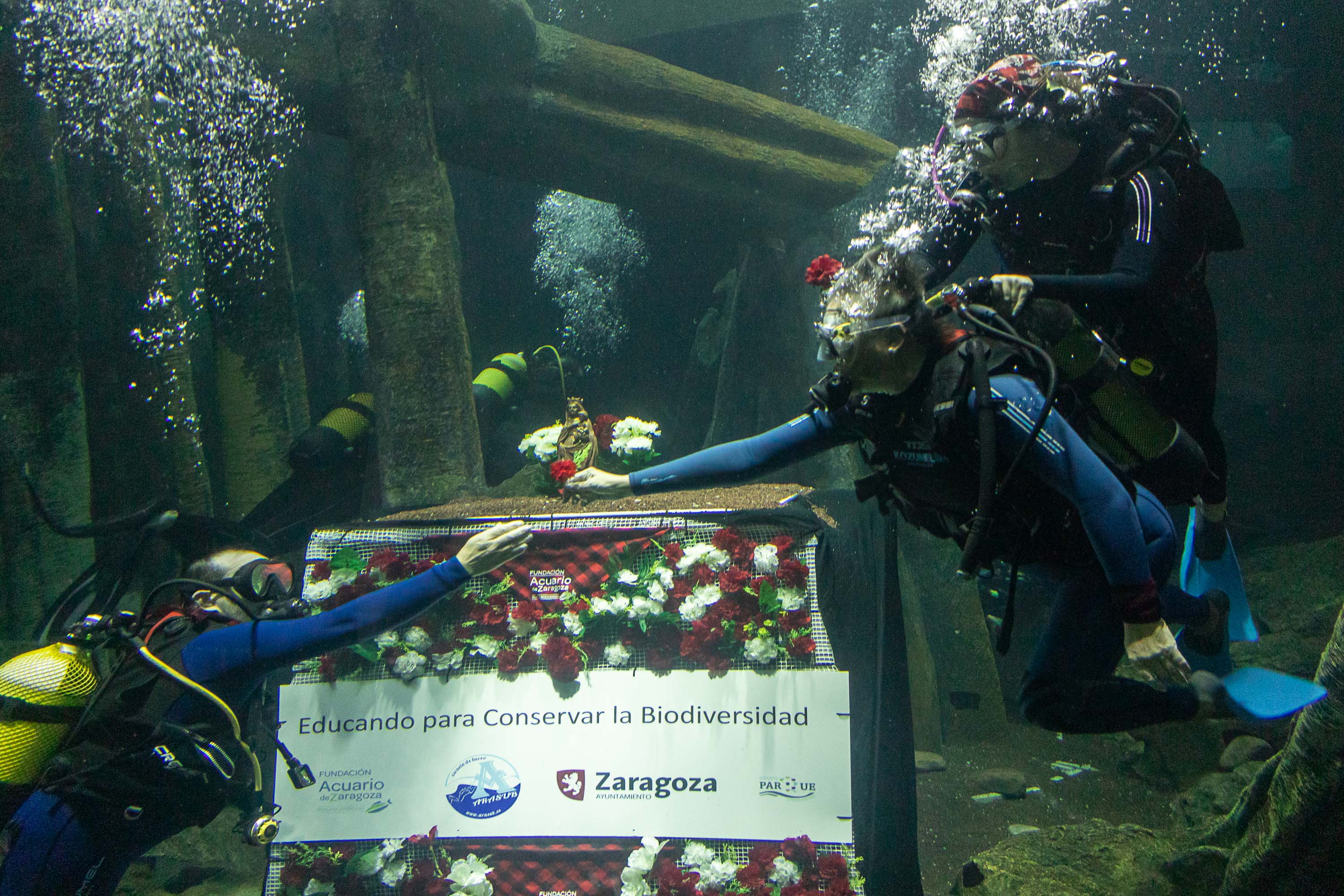Las personas mayores protagonizan este año la ofrenda floral subacuática en el Acuario de Zaragoza