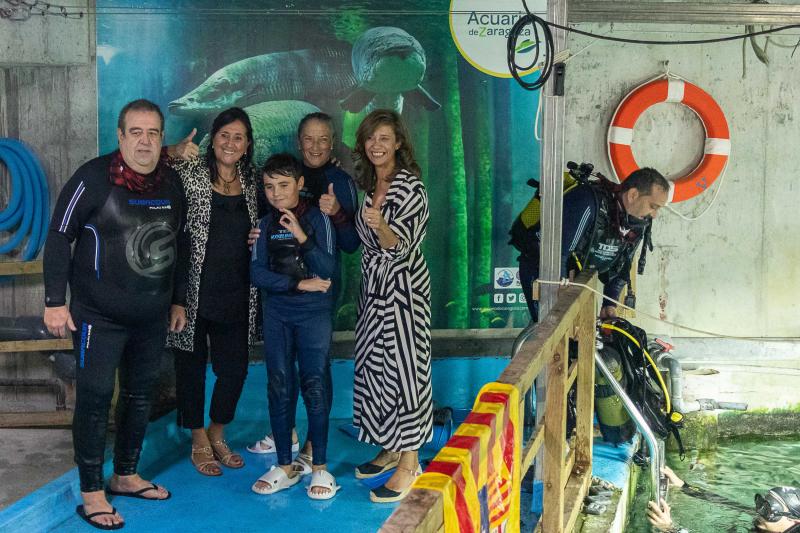 La tradicional ofrenda de flores a la Virgen del Pilar ha tenido este miércoles un anticipo en el Acuario de Zaragoza, donde un grupo de buceadores han depositado sus ramos ante una representación de la patrona sumergida en el agua y rodeada de arapaimas y otros peces. Dos de ellos han sido Francisco y Alicia, socios de los centros municipales de mayores Laín Entralgo y Oliver, que han participado en esta original iniciativa en representación de las personas mayores de la ciudad.