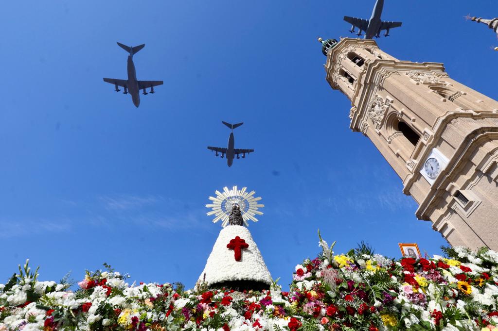 Los asistentes a la plaza del Pilar han podido contemplar al mediodía la participación en la Ofrenda de los aviones de la Base de Zaragoza, que la han sobrevolado un par de veces.